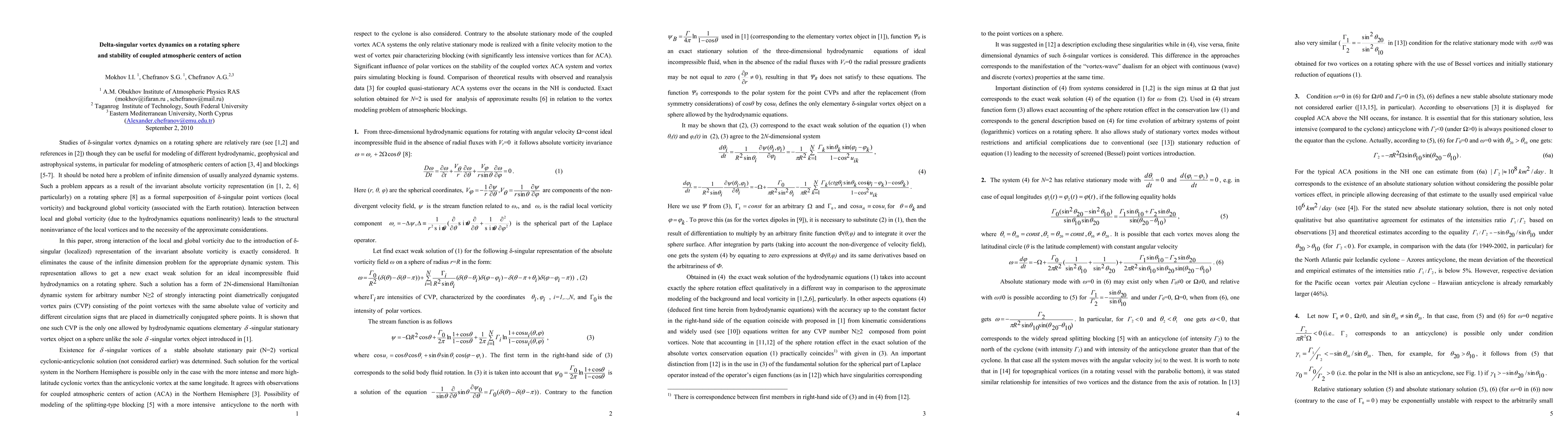 The paper presents a stationary mode for a dynamic system of two point vortices with different signs on a rotating sphere, supporting observed atmospheric data. It reveals that the cyclonic vortex must have a greater latitude than the anticyclonic one for this mode. The study also derives a criterion for the exponential instability of this stationary mode, considering polar vortex impacts, and confirms its theory with observed data of coupled cyclonic and anticyclonic atmospheric systems above Northern Hemisphere oceans.