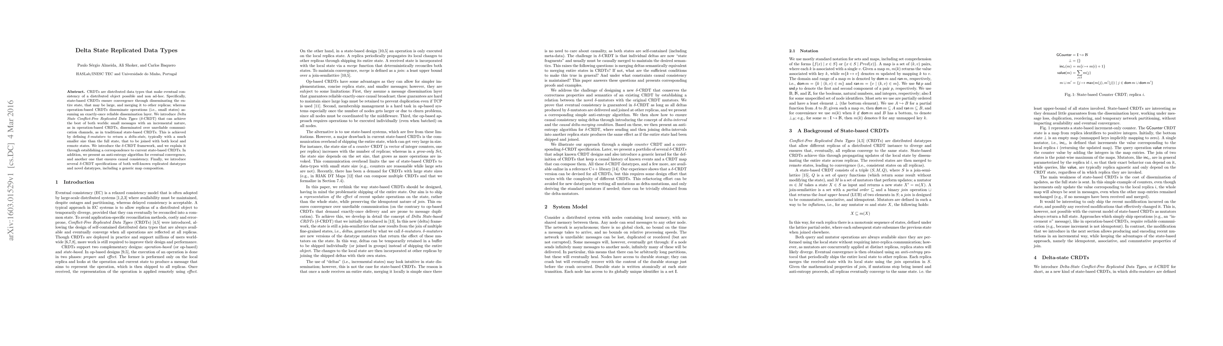 CRDTs are distributed data types that make eventual consistency of a distributed object possible and non ad-hoc. Specifically, state-based CRDTs ensure convergence through disseminating the entire state, that may be large, and merging it to other replicas; whereas operation-based CRDTs disseminate operations (i.e., small states) assuming an exactly-once reliable dissemination layer. We introduce Delta State Conflict-Free Replicated Data Types ($\delta$-CRDTs) that can achieve the best of both worlds: small messages with an incremental nature, as in operation-based CRDTs, disseminated over unreliable communication channels, as in traditional state-based CRDTs. This is achieved by defining delta mutators to return a delta-state, typically with a much smaller size than the full state, that to be joined with both local and remote states. We introduce the $\delta$-CRDT framework, and we explain it through establishing a correspondence to current state-based CRDTs. In addition, we present an anti-entropy algorithm for eventual convergence, and another one that ensures causal consistency. Finally, we introduce several $\delta$-CRDT specifications of both well-known replicated datatypes and novel datatypes, including a generic map composition.