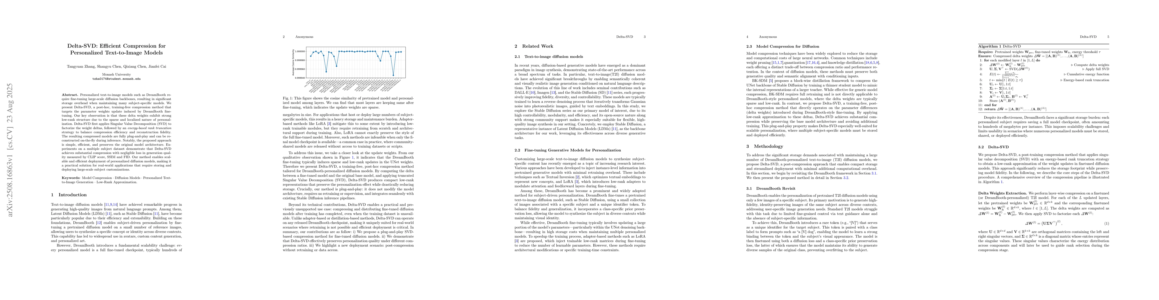 Personalized text-to-image models such as DreamBooth require fine-tuning large-scale diffusion backbones, resulting in significant storage overhead when maintaining many subject-specific models. We present Delta-SVD, a post-hoc, training-free compression method that targets the parameter weights update induced by DreamBooth fine-tuning. Our key observation is that these delta weights exhibit strong low-rank structure due to the sparse and localized nature of personalization. Delta-SVD first applies Singular Value Decomposition (SVD) to factorize the weight deltas, followed by an energy-based rank truncation strategy to balance compression efficiency and reconstruction fidelity. The resulting compressed models are fully plug-and-play and can be re-constructed on-the-fly during inference. Notably, the proposed approach is simple, efficient, and preserves the original model architecture. Experiments on a multiple subject dataset demonstrate that Delta-SVD achieves substantial compression with negligible loss in generation quality measured by CLIP score, SSIM and FID. Our method enables scalable and efficient deployment of personalized diffusion models, making it a practical solution for real-world applications that require storing and deploying large-scale subject customizations.