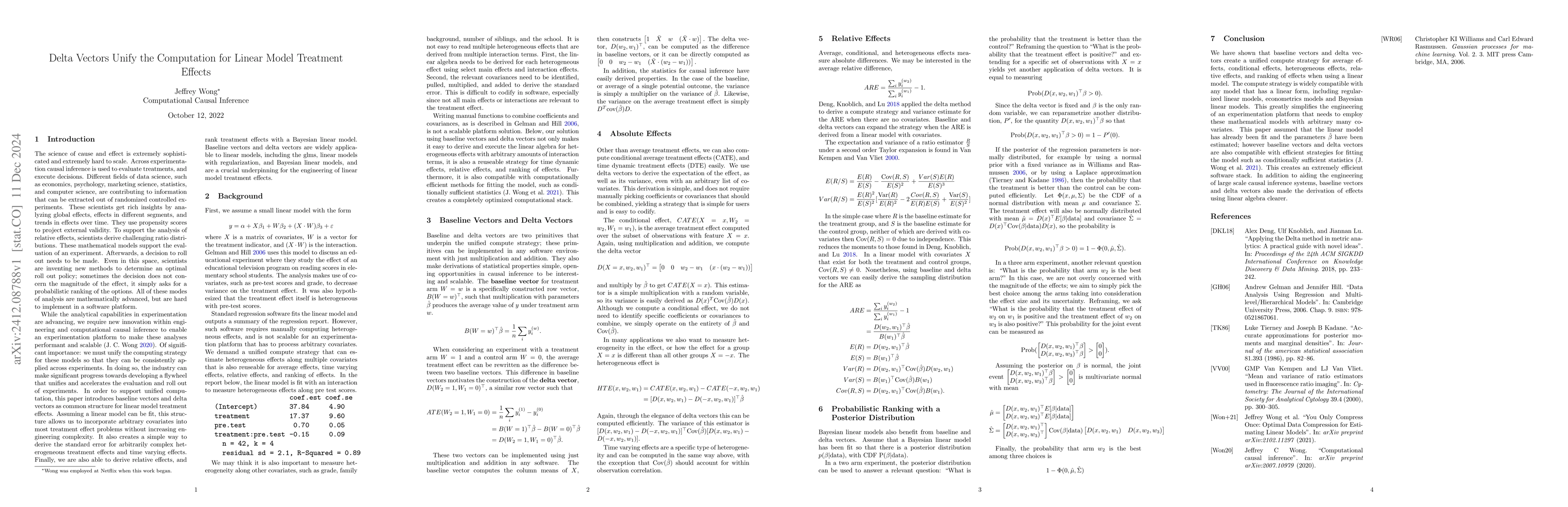 This paper introduces delta vectors to unify computation for linear model treatment effects, enabling consistent application across experiments and supporting scalable, performant analyses through a single, optimized API using linear algebra.