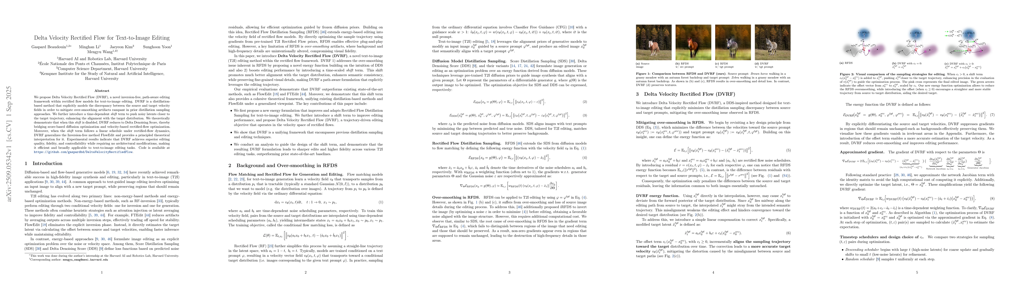 We propose Delta Velocity Rectified Flow (DVRF), a novel inversion-free, path-aware editing framework within rectified flow models for text-to-image editing. DVRF is a distillation-based method that explicitly models the discrepancy between the source and target velocity fields in order to mitigate over-smoothing artifacts rampant in prior distillation sampling approaches. We further introduce a time-dependent shift term to push noisy latents closer to the target trajectory, enhancing the alignment with the target distribution. We theoretically demonstrate that when this shift is disabled, DVRF reduces to Delta Denoising Score, thereby bridging score-based diffusion optimization and velocity-based rectified-flow optimization. Moreover, when the shift term follows a linear schedule under rectified-flow dynamics, DVRF generalizes the Inversion-free method FlowEdit and provides a principled theoretical interpretation for it. Experimental results indicate that DVRF achieves superior editing quality, fidelity, and controllability while requiring no architectural modifications, making it efficient and broadly applicable to text-to-image editing tasks. Code is available at https://github.com/gaspardbd/DeltaVelocityRectifiedFlow.