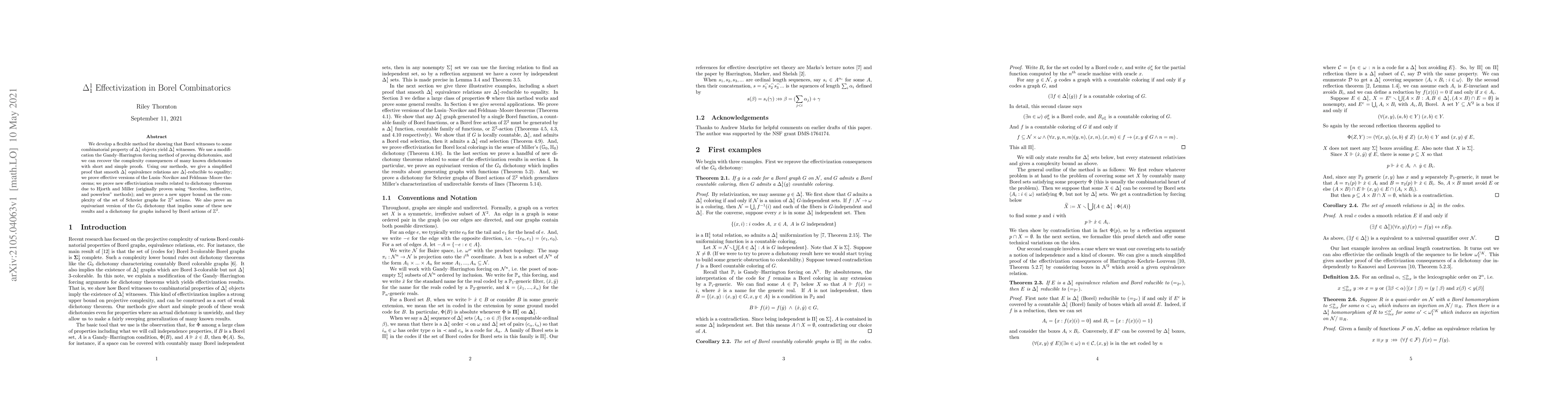 We develop a flexible method for showing that Borel witnesses to some combinatorial property of $\Delta^1_1$ objects yield $\Delta^1_1$ witnesses. We use a modification the Gandy--Harrington forcing method of proving dichotomies, and we can recover the complexity consequences of many known dichotomies with short and simple proofs. Using our methods, we give a simplified proof that smooth $\Delta^1_1$ equivalence relations are $\Delta^1_1$-reducible to equality; we prove effective versions of the Lusin--Novikov and Feldman--Moore theorems; we prove new effectivization results related to dichotomy theorems due to Hjorth and Miller (originally proven using ``forceless, ineffective, and powerless" methods); and we prove a new upper bound on the complexity of the set of Schreier graphs for $\mathbb{Z}^2$ actions. We also prove an equivariant version of the $G_0$ dichotomy that implies some of these new results and a dichotomy for graphs induced by Borel actions of $\mathbb{Z}^2$.
