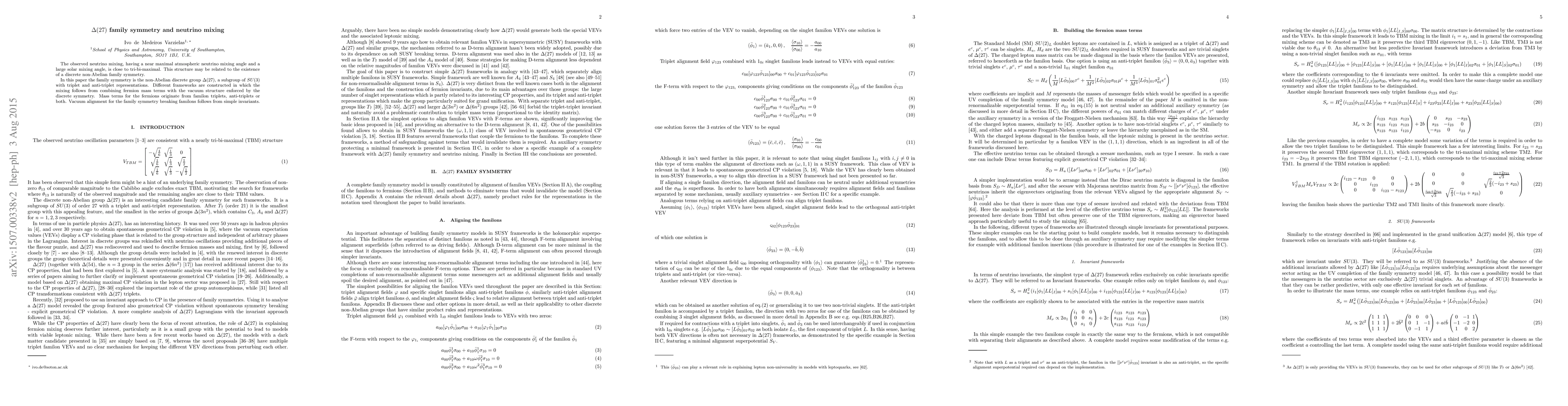 This paper explores the connection between the observed neutrino mixing patterns and the non-Abelian discrete group $\Delta(27)$, which is a subgroup of $SU(3)$. It constructs frameworks where the tri-bi-maximal mixing structure arises from fermion mass terms combined with the vacuum structure dictated by $\Delta(27)$ symmetry, with mass terms derived from familon triplets or anti-triplets.