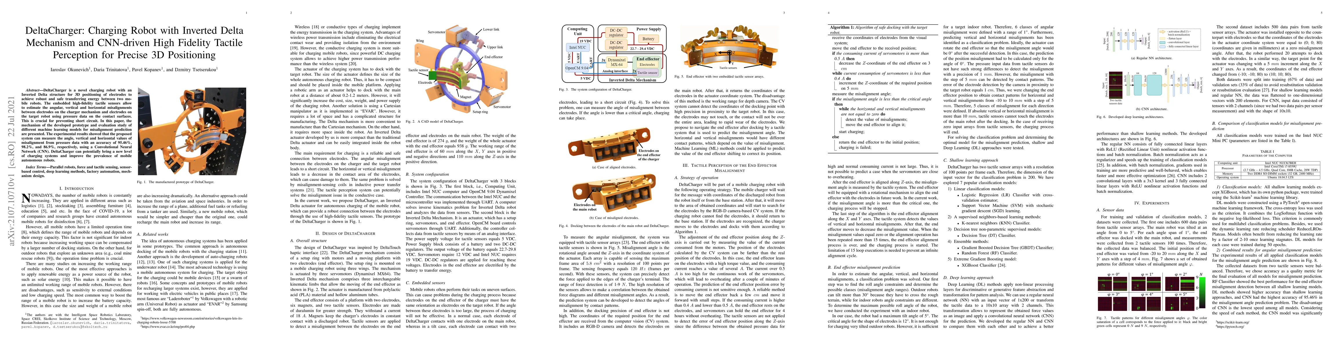 DeltaCharger is an innovative charging robot designed with an Inverted Delta mechanism for precise 3D electrode positioning, enabling safe energy transfer between mobile robots. The robot employs high-fidelity tactile sensors and a Convolutional Neural Network (CNN) to accurately predict misalignments, achieving 95.46%, 98.2%, and 86.9% accuracy in angle, vertical, and horizontal measurements, respectively. This advancement could enhance the efficiency and safety of charging systems for autonomous mobile robots.