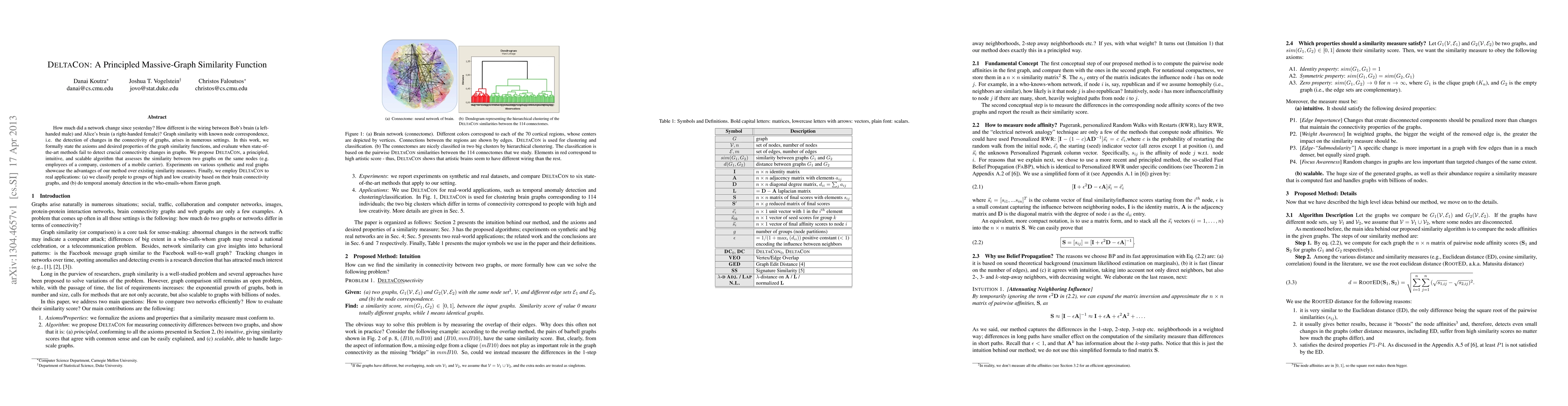 DeltaCon is a proposed scalable algorithm for evaluating graph similarity based on principled axioms, addressing the shortcomings of existing methods in detecting connectivity changes. It demonstrates superior performance in synthetic and real-world applications, including brain connectivity analysis and temporal anomaly detection in the Enron email graph.