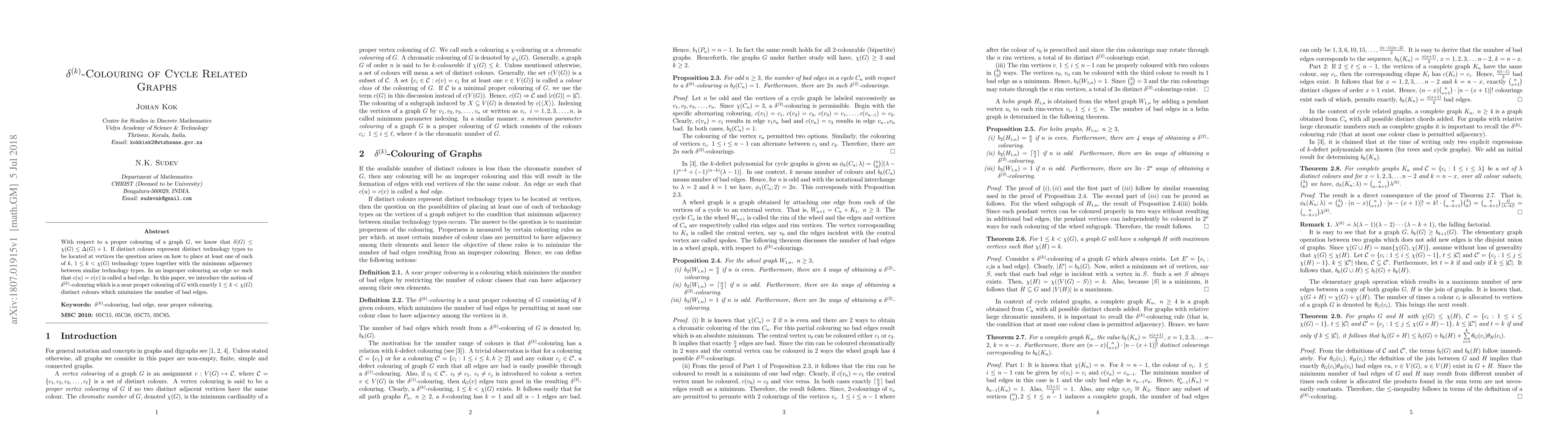 With respect to a proper colouring of a graph $G$, we know that $\delta(G) \leq \chi(G) \leq \Delta(G)+1$. If distinct colours represent distinct technology types to be located at vertices the question arises on how to place at least one of each of $k$, $1\leq k < \chi(G)$ technology types together with the minimum adjacency between similar technology types. In an improper colouring an edge $uv$ such that $c(u)=c(v)$ is called a bad edge. In this paper, we introduce the notion of $\delta^{(k)}$-colouring which is a near proper colouring of $G$ with exactly $1\leq k < \chi(G)$ distinct colours which minimizes the number of bad edges.