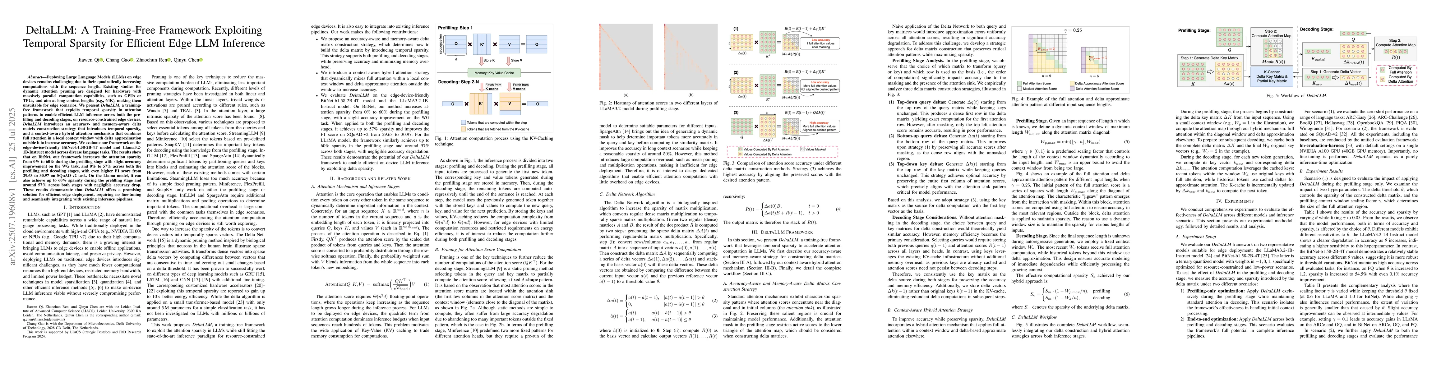 Deploying Large Language Models (LLMs) on edge devices remains challenging due to their quadratically increasing computations with the sequence length. Existing studies for dynamic attention pruning are designed for hardware with massively parallel computation capabilities, such as GPUs or TPUs, and aim at long context lengths (e.g., 64K), making them unsuitable for edge scenarios. We present DeltaLLM, a training-free framework that exploits temporal sparsity in attention patterns to enable efficient LLM inference across both the prefilling and decoding stages, on resource-constrained edge devices. DeltaLLM introduces an accuracy- and memory-aware delta matrix construction strategy that introduces temporal sparsity, and a context-aware hybrid attention mechanism that combines full attention in a local context window with delta approximation outside it to increase accuracy. We evaluate our framework on the edge-device-friendly BitNet-b1.58-2B-4T model and Llama3.2-1B-Instruct model across diverse language tasks. The results show that on BitNet, our framework increases the attention sparsity from 0% to 60% during the prefilling stage with slight accuracy improvement on the WG task, and 0% to 57% across both the prefilling and decoding stages, with even higher F1 score from 29.63 to 30.97 on SQuAD-v2 task. On the Llama model, it can also achieve up to 60% sparsity during the prefilling stage and around 57% across both stages with negligible accuracy drop. These results demonstrate that DeltaLLM offers a promising solution for efficient edge deployment, requiring no fine-tuning and seamlessly integrating with existing inference pipelines.