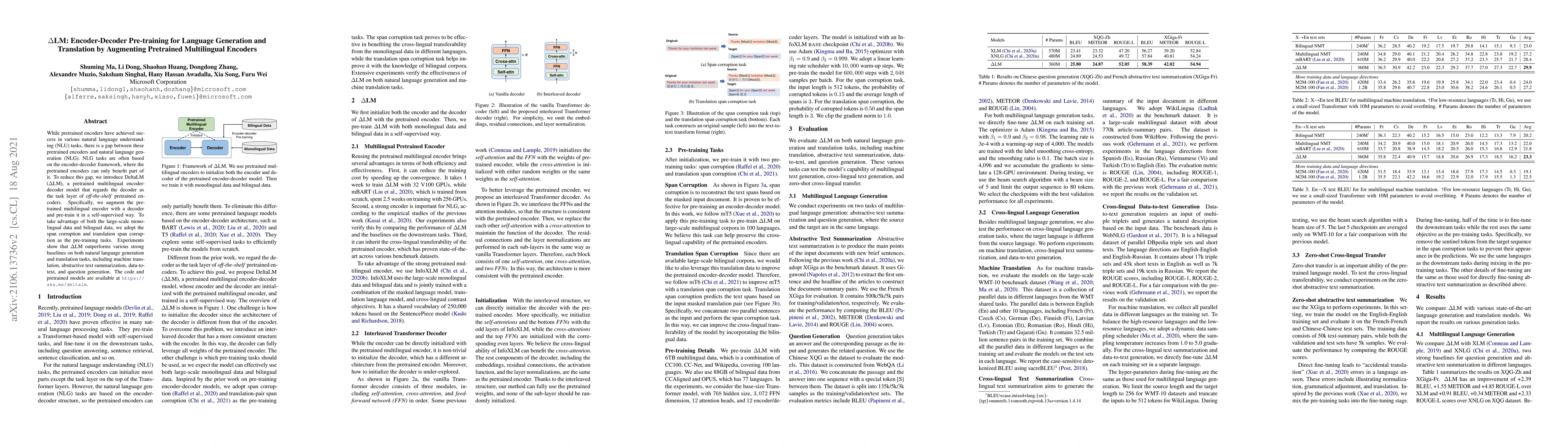 DeltaLM enhances pretrained multilingual encoders by integrating an encoder-decoder framework, achieving superior performance in natural language generation and translation tasks through self-supervised pre-training using span corruption and translation span corruption techniques. The model outperforms strong baselines across various applications.