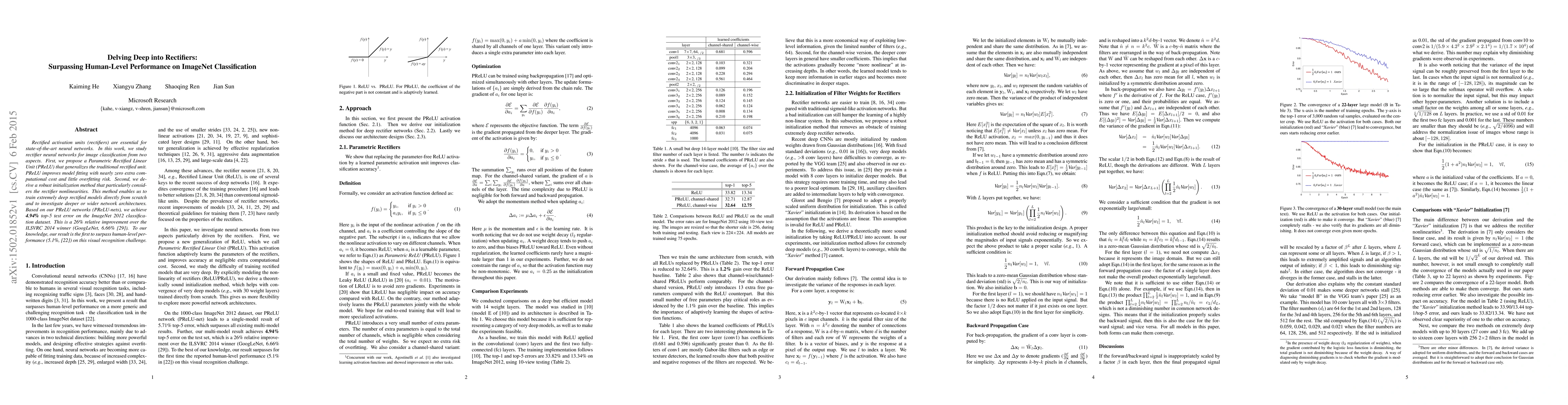 Rectified activation units (rectifiers) are essential for state-of-the-art neural networks. In this work, we study rectifier neural networks for image classification from two aspects. First, we propose a Parametric Rectified Linear Unit (PReLU) that generalizes the traditional rectified unit. PReLU improves model fitting with nearly zero extra computational cost and little overfitting risk. Second, we derive a robust initialization method that particularly considers the rectifier nonlinearities. This method enables us to train extremely deep rectified models directly from scratch and to investigate deeper or wider network architectures. Based on our PReLU networks (PReLU-nets), we achieve 4.94% top-5 test error on the ImageNet 2012 classification dataset. This is a 26% relative improvement over the ILSVRC 2014 winner (GoogLeNet, 6.66%). To our knowledge, our result is the first to surpass human-level performance (5.1%, Russakovsky et al.) on this visual recognition challenge.