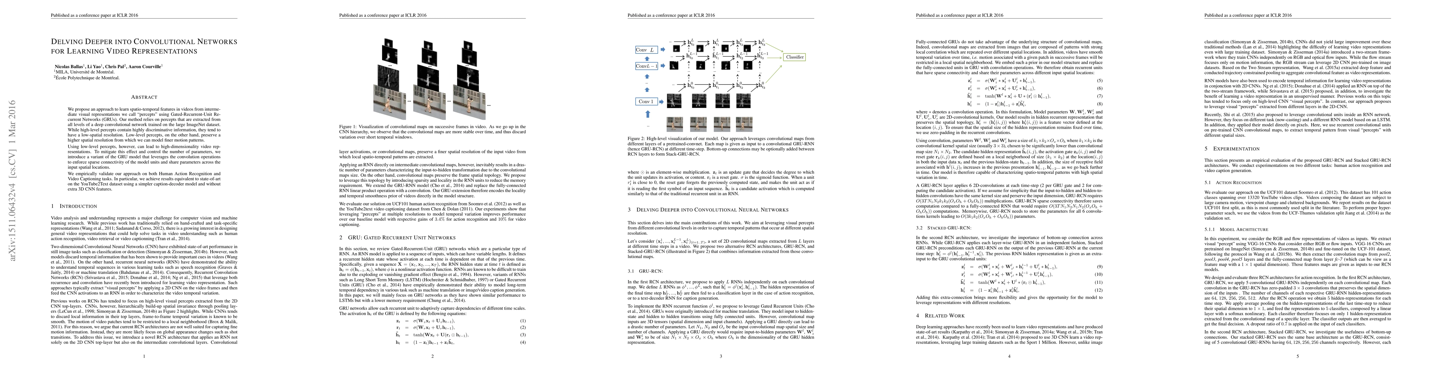 We propose an approach to learn spatio-temporal features in videos from intermediate visual representations we call "percepts" using Gated-Recurrent-Unit Recurrent Networks (GRUs).Our method relies on percepts that are extracted from all level of a deep convolutional network trained on the large ImageNet dataset. While high-level percepts contain highly discriminative information, they tend to have a low-spatial resolution. Low-level percepts, on the other hand, preserve a higher spatial resolution from which we can model finer motion patterns. Using low-level percepts can leads to high-dimensionality video representations. To mitigate this effect and control the model number of parameters, we introduce a variant of the GRU model that leverages the convolution operations to enforce sparse connectivity of the model units and share parameters across the input spatial locations. We empirically validate our approach on both Human Action Recognition and Video Captioning tasks. In particular, we achieve results equivalent to state-of-art on the YouTube2Text dataset using a simpler text-decoder model and without extra 3D CNN features.