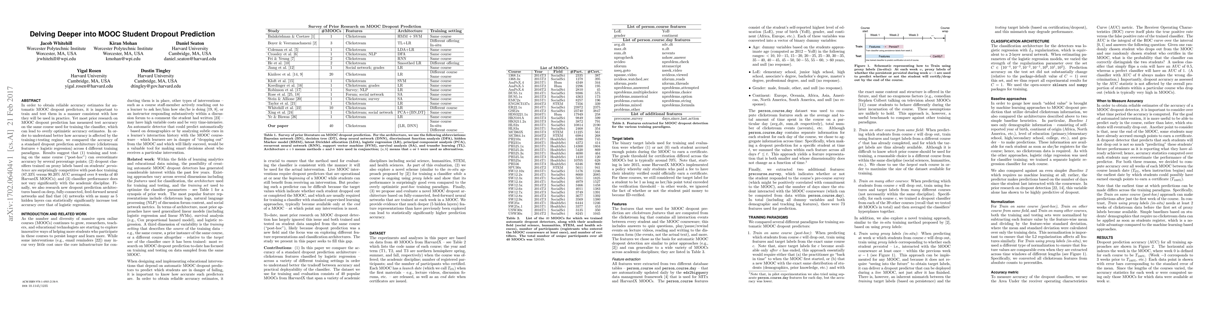 This paper investigates the accuracy of MOOC dropout predictors, finding that training and testing on the same course can overestimate accuracy. It reveals that classifiers trained on proxy labels perform nearly as well as those trained post-hoc, and deep neural networks with up to 5 hidden layers significantly improve test accuracy over logistic regression.