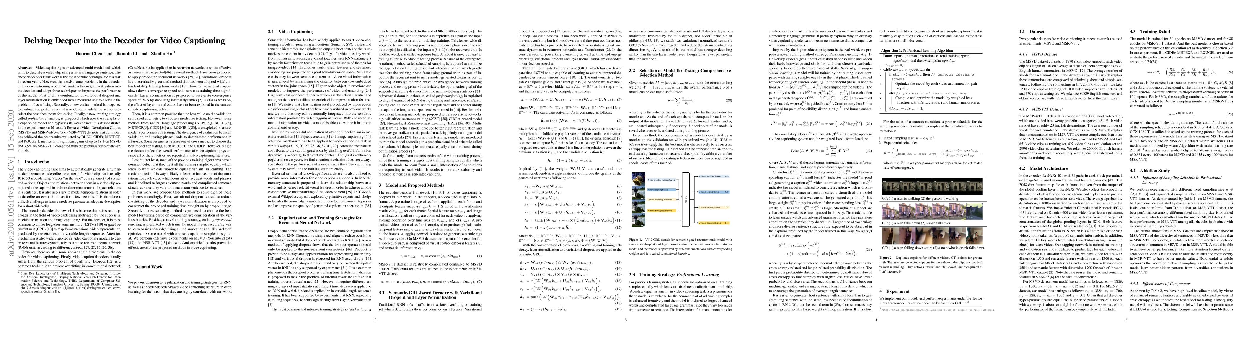 This research paper addresses decoder-related issues in video captioning models using an encoder-decoder framework. It introduces three improvements: (1) a dropout and layer normalization combination to reduce overfitting, (2) an online validation method for selecting the best model checkpoint, and (3) a professional learning strategy to leverage model strengths and bypass weaknesses. Experiments on MSVD and MSR-VTT datasets show significant BLEU, CIDEr, METEOR, and ROUGE-L score improvements, up to 18% on MSVD and 3.5% on MSR-VTT, compared to previous state-of-the-art models.