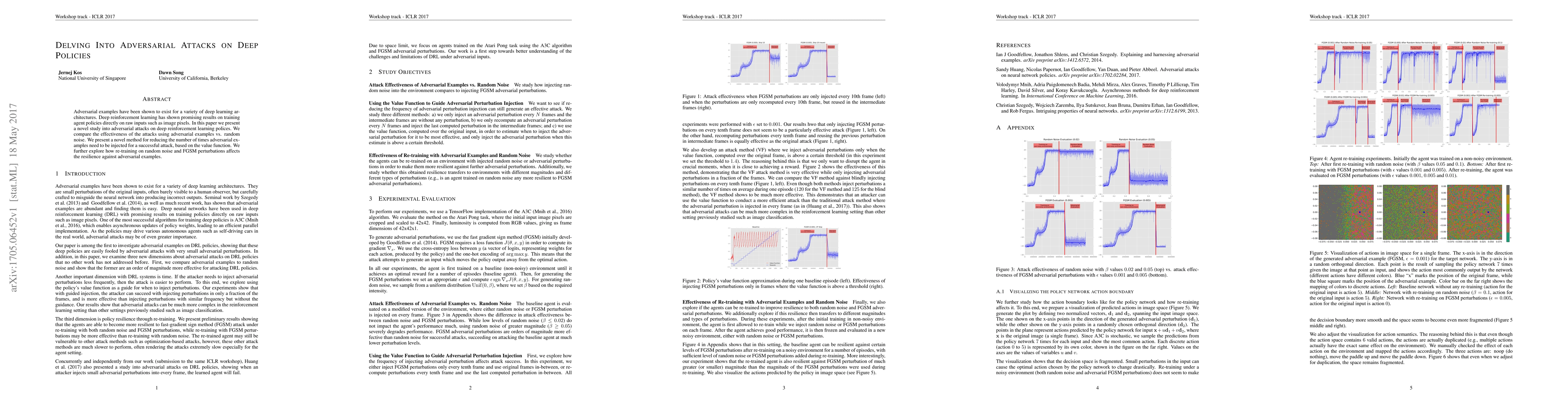 This paper investigates adversarial attacks on deep reinforcement learning policies, comparing the effectiveness of adversarial examples versus random noise. It introduces a novel method to reduce the number of adversarial examples needed for successful attacks, based on the value function, and examines how re-training on random noise and FGSM perturbations enhances resilience against adversarial examples.