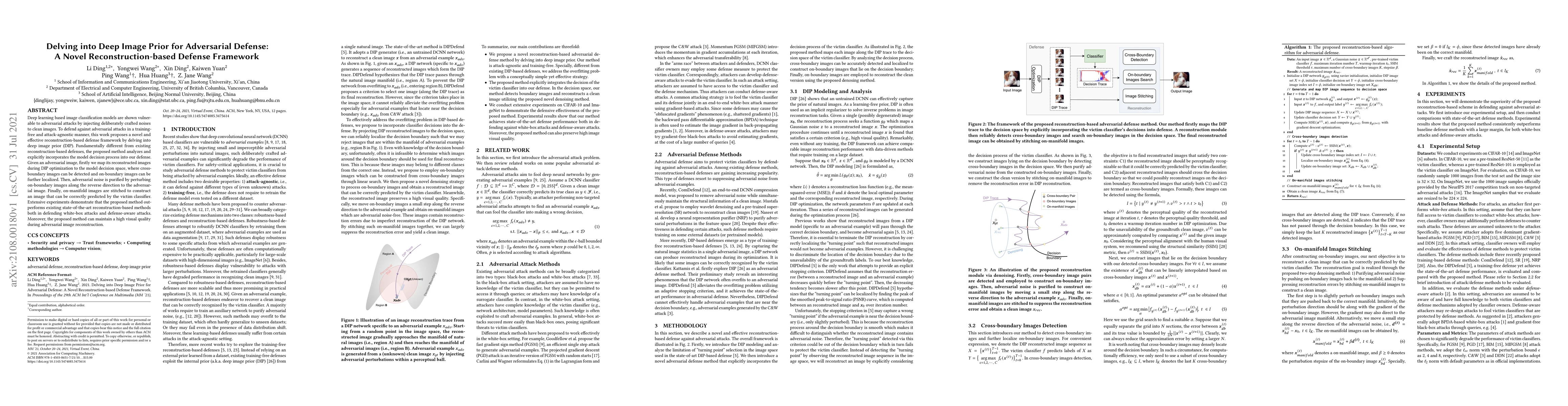 This paper proposes a novel reconstruction-based defense framework using deep image prior (DIP) to defend against adversarial attacks without requiring training. The method maps adversarial images to model decision space, detects and localizes cross-boundary images, and purifies adversarial noise to reconstruct images correctly predicted by the classifier, outperforming existing methods.