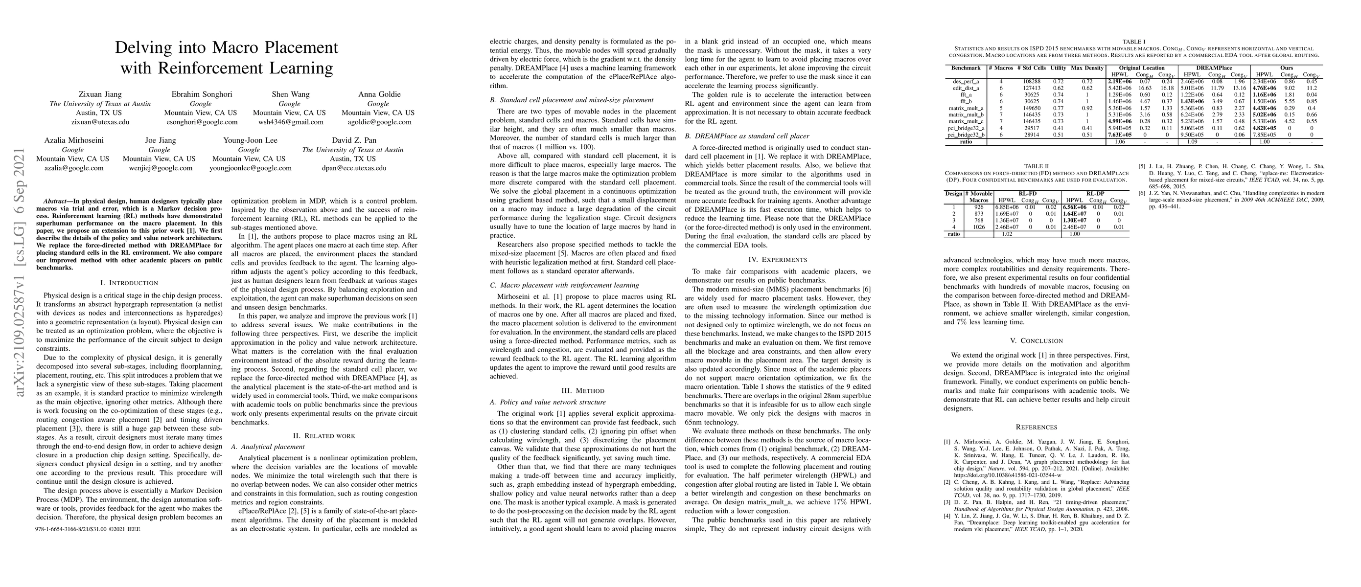 This paper extends prior reinforcement learning techniques for macro placement in physical design, proposing a new architecture and replacing the force-directed method with DREAMPlace. The improved method is compared against other academic placers on public benchmarks.
