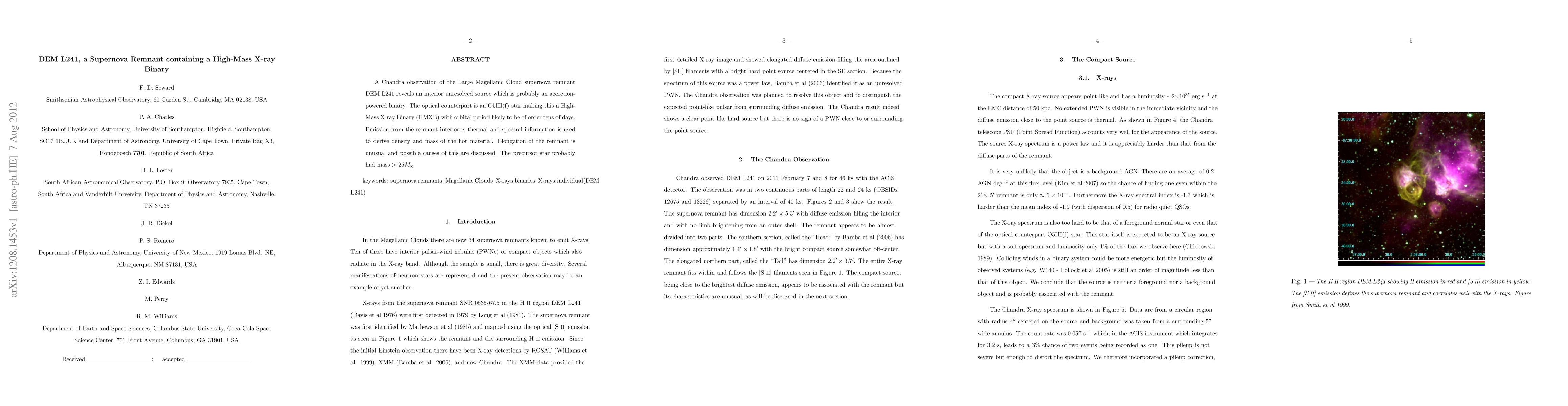 A Chandra observation of the Large Magellanic Cloud supernova remnant DEM L241 reveals an interior unresolved source which is probably an accretion-powered binary. The optical counterpart is an O5III(f) star making this a High-Mass X-ray Binary (HMXB) with orbital period likely to be of order tens of days. Emission from the remnant interior is thermal and spectral information is used to derive density and mass of the hot material. Elongation of the remnant is unusual and possible causes of this are discussed. The precursor star probably had mass > 25 solar masses