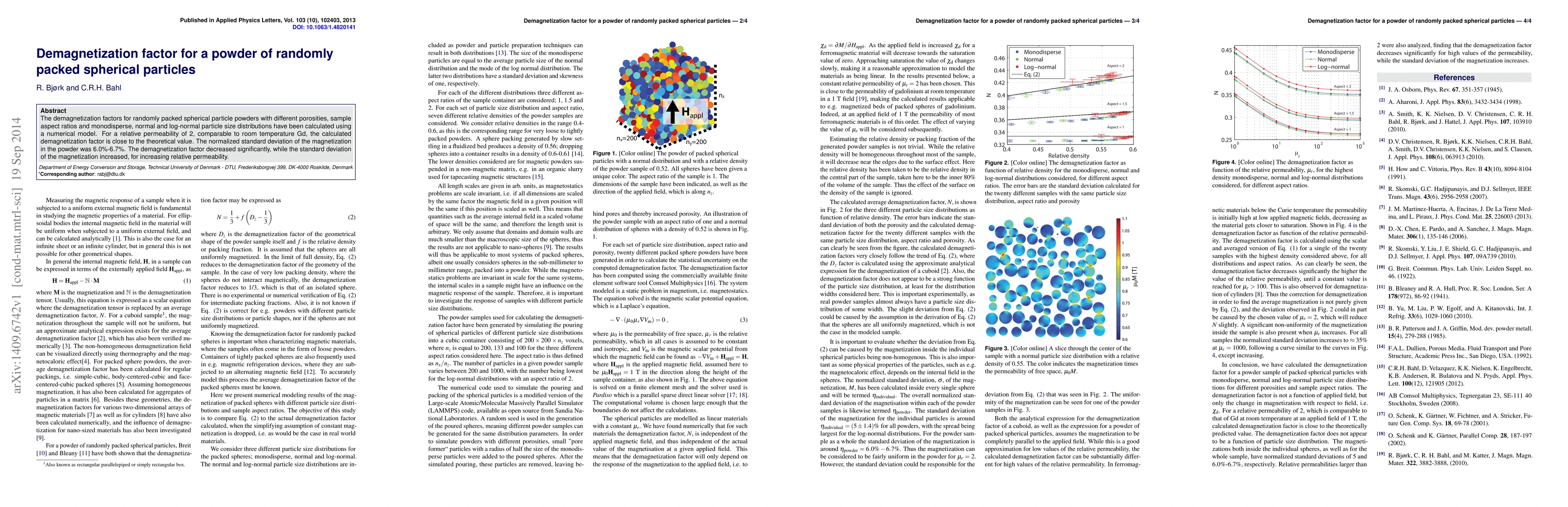 The demagnetization factors for randomly packed spherical particle powders with different porosities, sample aspect ratios and monodisperse, normal and log-normal particle size distributions have been calculated using a numerical model. For a relative permeability of 2, comparable to room temperature Gd, the calculated demagnetization factor is close to the theoretical value. The normalized standard deviation of the magnetization in the powder was 6.0%-6.7%. The demagnetization factor decreased significantly, while the standard deviation of the magnetization increased, for increasing relative permeability.