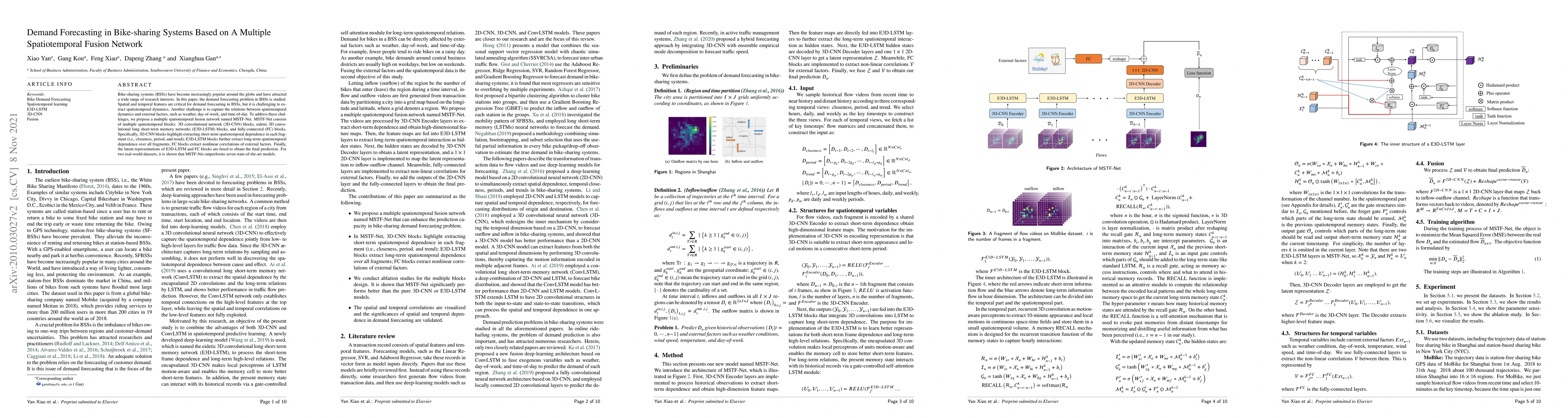 Bike-sharing systems (BSSs) have become increasingly popular around the globe and have attracted a wide range of research interests. In this paper, the demand forecasting problem in BSSs is studied. Spatial and temporal features are critical for demand forecasting in BSSs, but it is challenging to extract spatiotemporal dynamics. Another challenge is to capture the relations between spatiotemporal dynamics and external factors, such as weather, day-of-week, and time-of-day. To address these challenges, we propose a multiple spatiotemporal fusion network named MSTF-Net. MSTF-Net consists of multiple spatiotemporal blocks: 3D convolutional network (3D-CNN) blocks, eidetic 3D convolutional long short-term memory networks (E3D-LSTM) blocks, and fully-connected (FC) blocks. Specifically, 3D-CNN blocks highlight extracting short-term spatiotemporal dependence in each fragment (i.e., closeness, period, and trend); E3D-LSTM blocks further extract long-term spatiotemporal dependence over all fragments; FC blocks extract nonlinear correlations of external factors. Finally, the latent representations of E3D-LSTM and FC blocks are fused to obtain the final prediction. For two real-world datasets, it is shown that MSTF-Net outperforms seven state-of-the-art models.