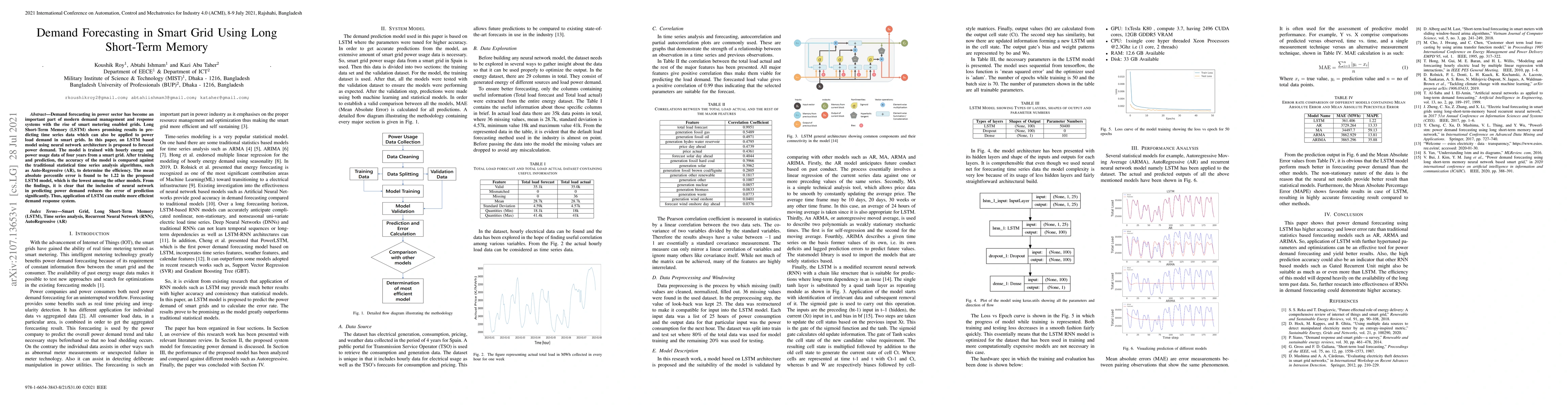 This paper proposes an LSTM-based neural network model for forecasting power demand in smart grids, demonstrating superior accuracy compared to traditional statistical methods like Auto-Regressive (AR) models, with a mean absolute percentile error of 1.22. The results suggest that LSTM enhances the efficiency of demand response systems.
