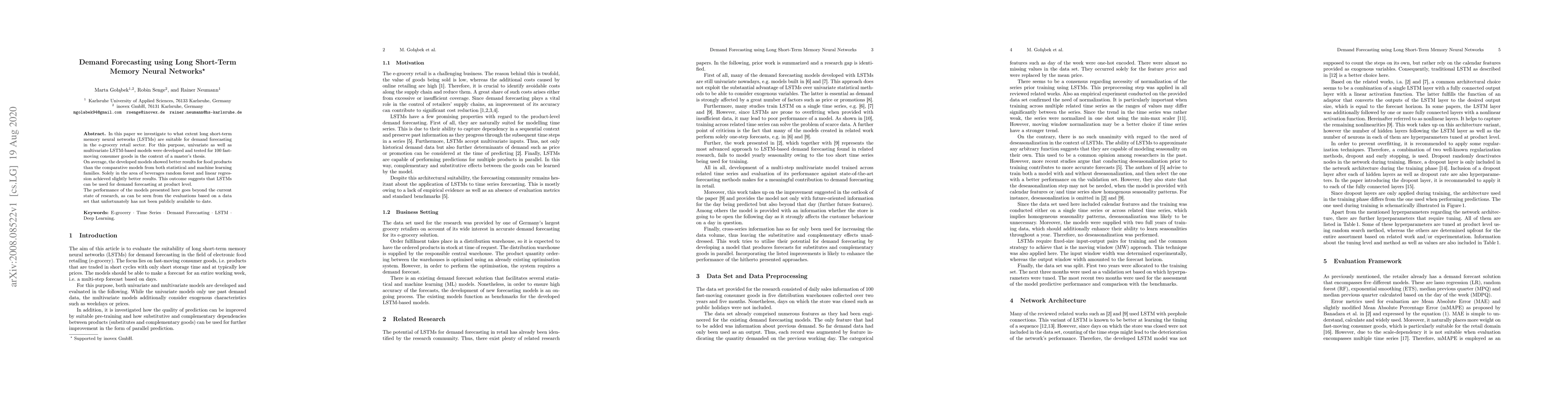 In this paper we investigate to what extent long short-term memory neural networks (LSTMs) are suitable for demand forecasting in the e-grocery retail sector. For this purpose, univariate as well as multivariate LSTM-based models were developed and tested for 100 fast-moving consumer goods in the context of a master's thesis. On average, the developed models showed better results for food products than the comparative models from both statistical and machine learning families. Solely in the area of beverages random forest and linear regression achieved slightly better results. This outcome suggests that LSTMs can be used for demand forecasting at product level. The performance of the models presented here goes beyond the current state of research, as can be seen from the evaluations based on a data set that unfortunately has not been publicly available to date.