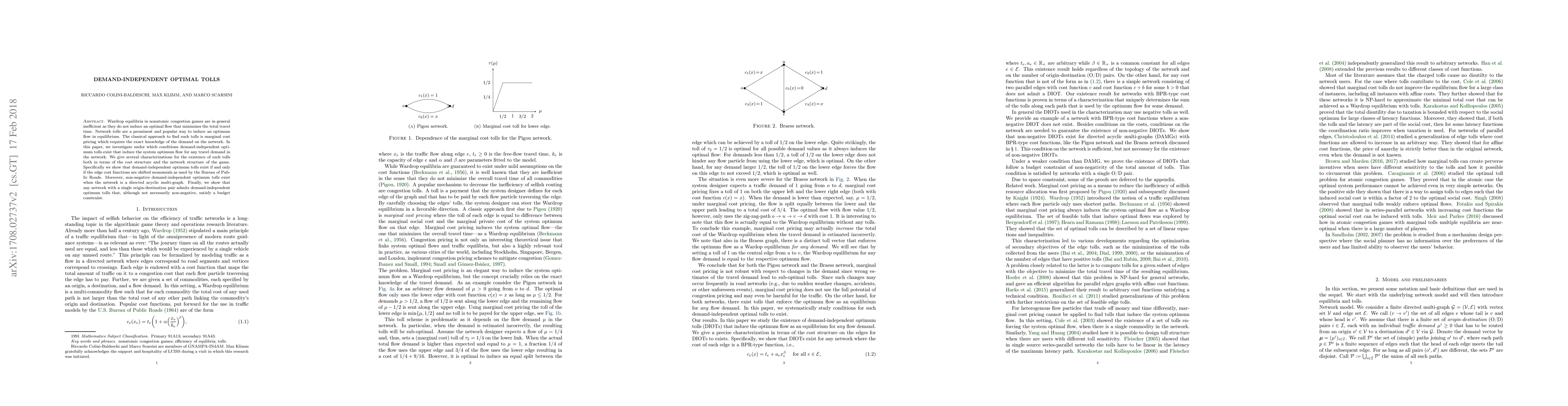 Wardrop equilibria in nonatomic congestion games are in general inefficient as they do not induce an optimal flow that minimizes the total travel time. Network tolls are a prominent and popular way to induce an optimum flow in equilibrium. The classical approach to find such tolls is marginal cost pricing which requires the exact knowledge of the demand on the network. In this paper, we investigate under which conditions demand-independent optimum tolls exist that induce the system optimum flow for any travel demand in the network. We give several characterizations for the existence of such tolls both in terms of the cost structure and the network structure of the game. Specifically we show that demand-independent optimum tolls exist if and only if the edge cost functions are shifted monomials as used by the Bureau of Public Roads. Moreover, non-negative demand-independent optimum tolls exist when the network is a directed acyclic multi-graph. Finally, we show that any network with a single origin-destination pair admits demand-independent optimum tolls that, although not necessarily non-negative, satisfy a budget constraint.