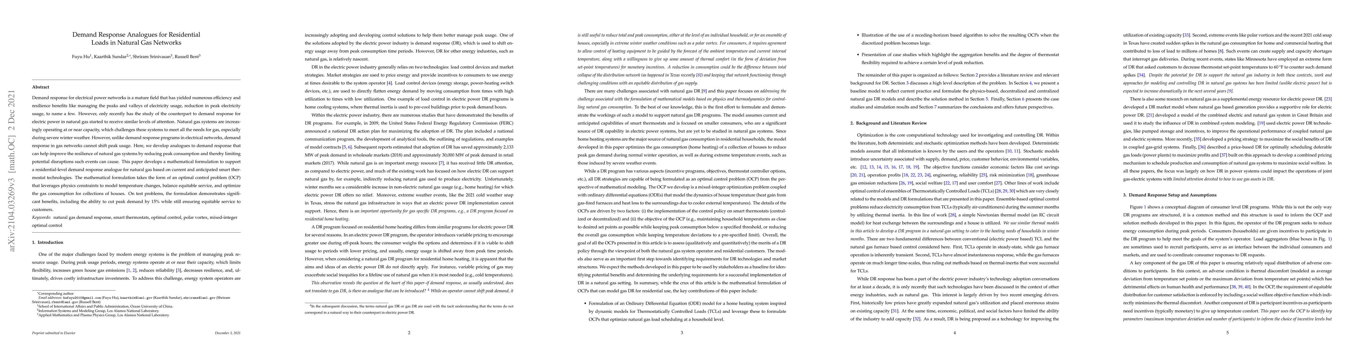 This paper explores demand response analogues for natural gas networks to enhance system resilience by reducing peak consumption. It develops a mathematical optimal control problem to optimize gas usage for residential loads, demonstrating a 15% reduction in peak demand while maintaining equitable service.