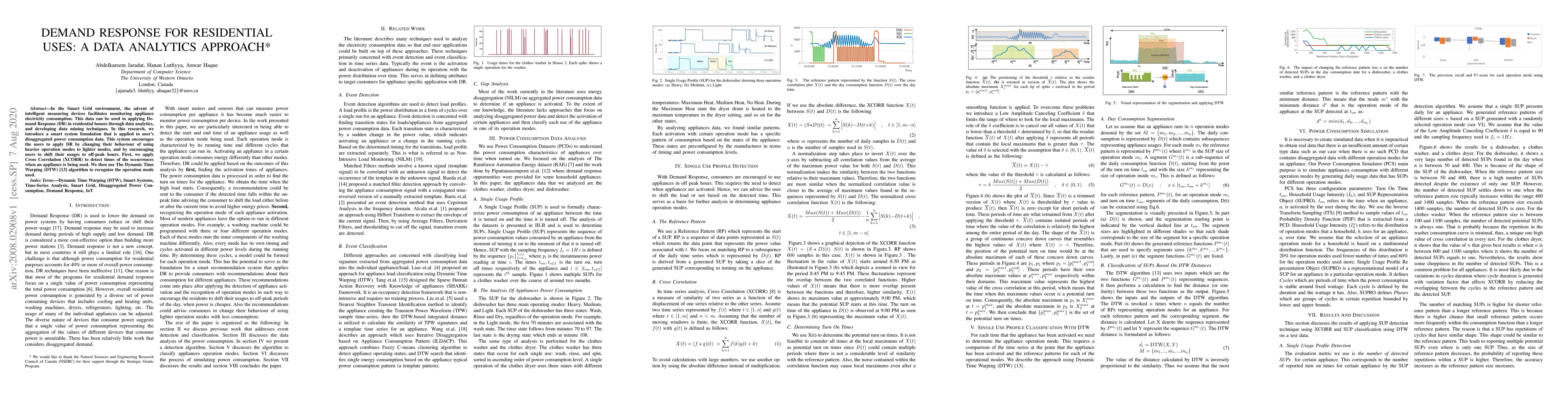 In the Smart Grid environment, the advent of intelligent measuring devices facilitates monitoring appliance electricity consumption. This data can be used in applying Demand Response (DR) in residential houses through data analytics, and developing data mining techniques. In this research, we introduce a smart system foundation that is applied to user's disaggregated power consumption data. This system encourages the users to apply DR by changing their behaviour of using heavier operation modes to lighter modes, and by encouraging users to shift their usages to off-peak hours. First, we apply Cross Correlation (XCORR) to detect times of the occurrences when an appliance is being used. We then use The Dynamic Time Warping (DTW) to recognize the operation mode used.