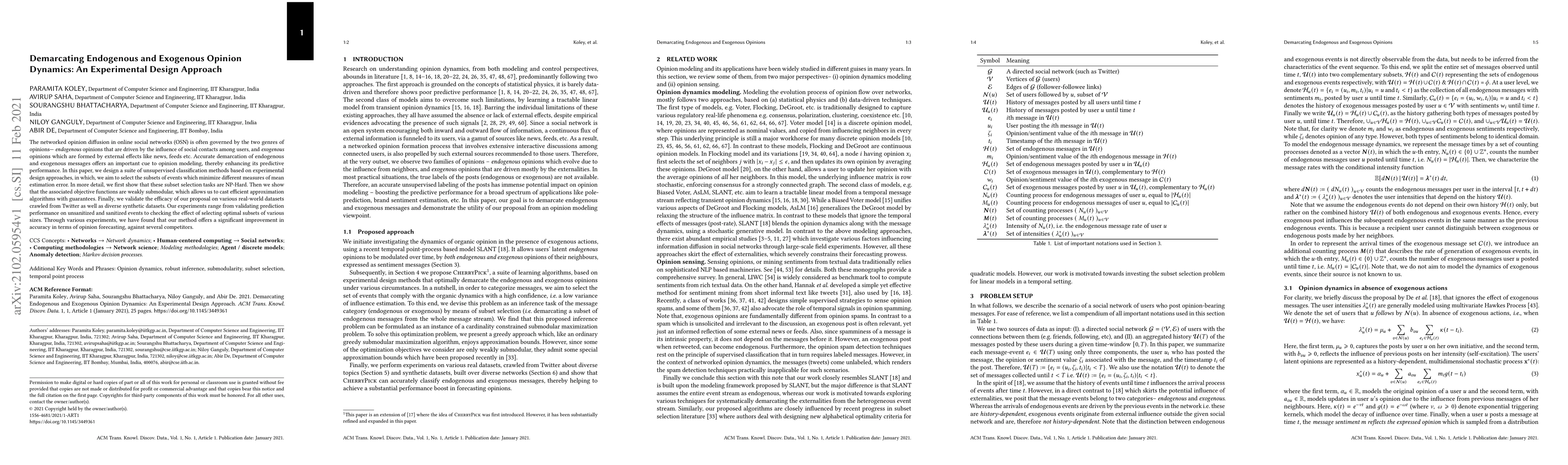 This paper proposes unsupervised classification methods to distinguish between endogenous and exogenous opinions in online social networks, using experimental design to select optimal subsets of events. The authors demonstrate that these tasks are NP-Hard and weakly submodular, enabling efficient approximation algorithms, and validate their approach on real and synthetic datasets, showing significant improvements in opinion forecasting accuracy.