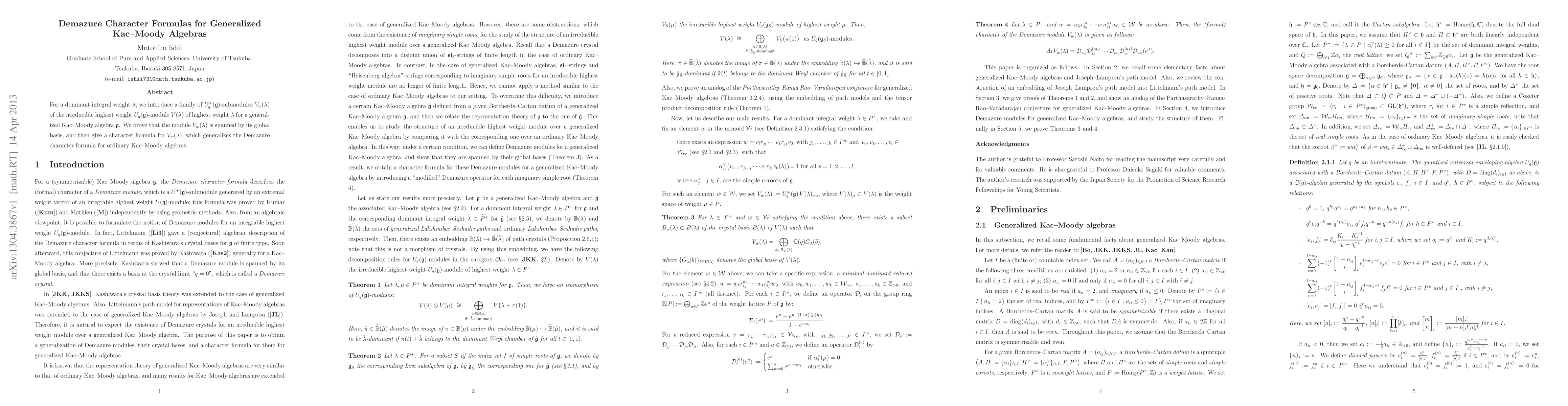 This paper introduces $U_q^+$-submodules $V_w (λ)$ of irreducible highest weight modules for generalized Kac-Moody algebras, proving they are spanned by a global basis and providing a generalized Demazure character formula.
