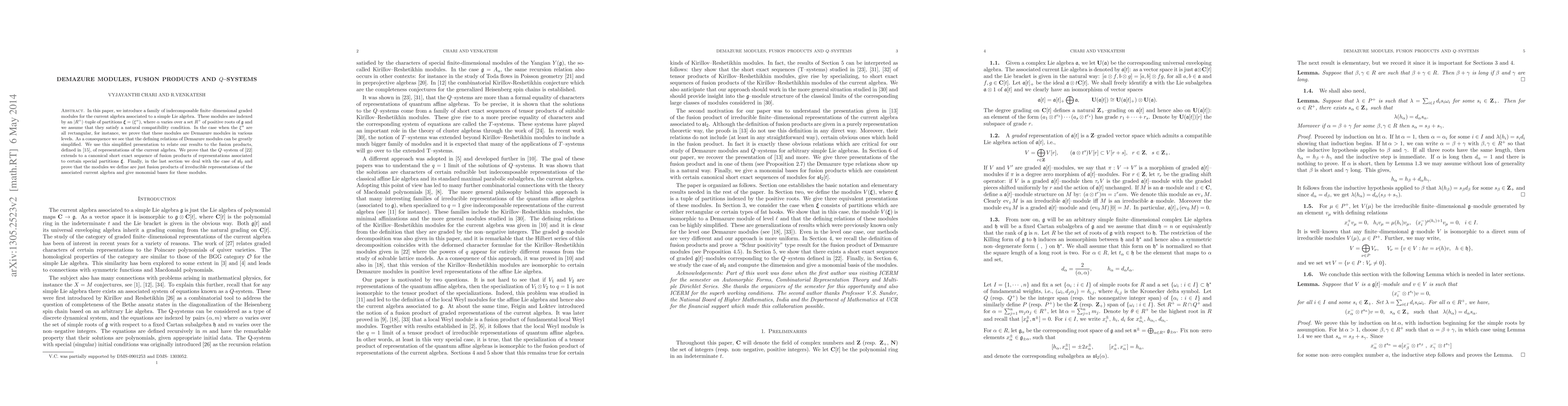 In this paper, we introduce a family of indecomposable finite--dimensional graded modules for the current algebra associated to a simple Lie algebra. These modules are indexed by a tuple of partitions one for each positive root of the simple Lie algebra. We assume that the partitions satisfy a natural compatibility condition. In the case when the partitions are all rectangular, for instance, we prove that these are precisely the Demazure modules which are stable under the action of the simple Lie algebra. As a consequence we see that the defining relations of these Demazure modules can be greatly simplified. We use this simplified presentation to relate our results to the fusion products (defined by Feigin and Loktev) of representations of the current algebra. We prove that the Q--system can be actually thought of as a canonical short exact of the fusion products of representations associated to certain special partitions. Finally, in the last section we deal with the case of sl(2) and prove that the modules we define are just fusion products of irreducible representations of the associated current algebra. We also give monomial bases for these modules.