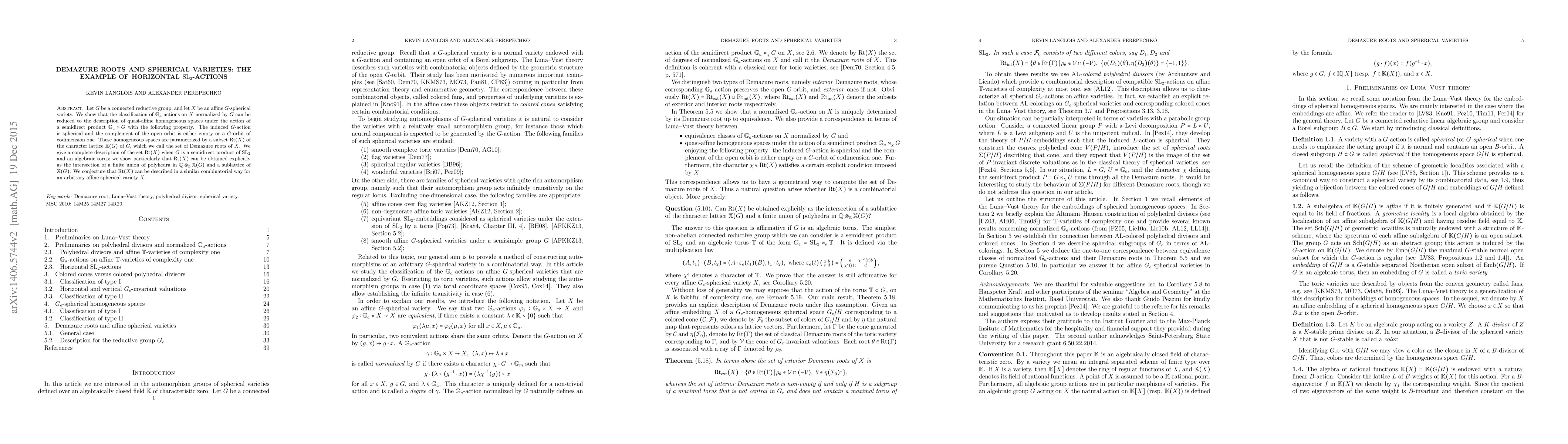 Let $G$ be a connected reductive group, and let $X$ be an affine $G$-spherical variety. We show that the classification of $\mathbb{G}_{a}$-actions on $X$ normalized by $G$ can be reduced to the description of quasi-affine homogeneous spaces under the action of a semi-direct product $\mathbb{G}_{a}\rtimes G$ with the following property. The induced $G$-action is spherical and the complement of the open orbit is either empty or a $G$-orbit of codimension one. These homogeneous spaces are parametrized by a subset ${\rm Rt}(X)$ of the character lattice $\mathbb{X}(G)$ of $G$, which we call the set of Demazure roots of $X$. We give a complete description of the set ${\rm Rt}(X)$ when $G$ is a semi-direct product of ${\rm SL}_{2}$ and an algebraic torus; we show particularly that ${\rm Rt}(X)$ can be obtained explicitly as the intersection of a finite union of polyhedra in $\mathbb{Q}\otimes_{\mathbb{Z}}\mathbb{X}(G)$ and a sublattice of $\mathbb{X}(G)$. We conjecture that ${\rm Rt}(X)$ can be described in a similar combinatorial way for an arbitrary affine spherical variety $X$.