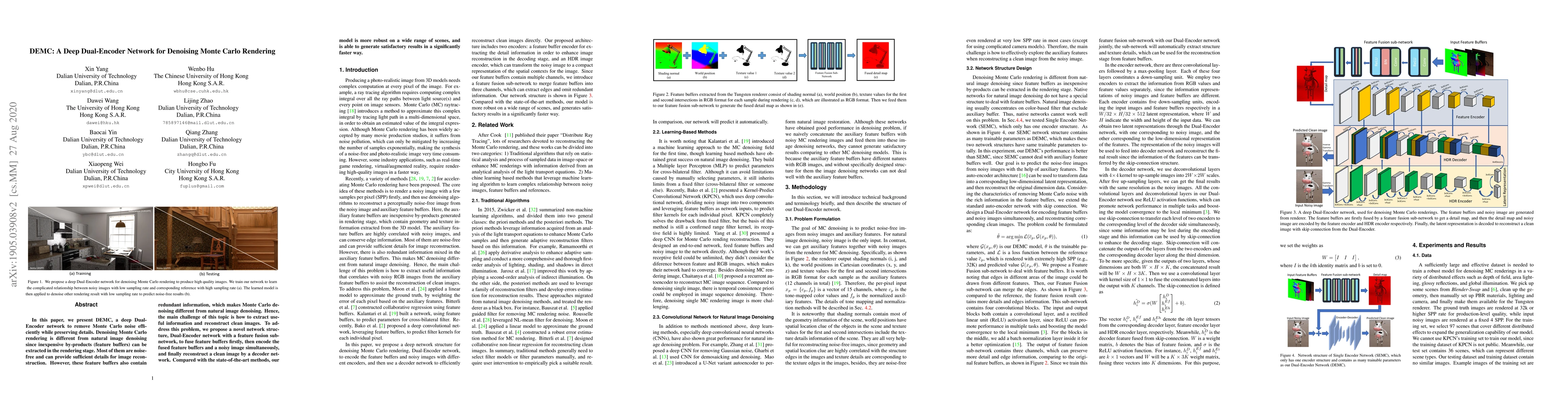 DEMC is a deep Dual-Encoder network designed to efficiently remove Monte Carlo noise while preserving image details. It leverages feature buffers from the rendering stage to extract useful information and reconstruct clean images, achieving faster and more robust results compared to existing methods.
