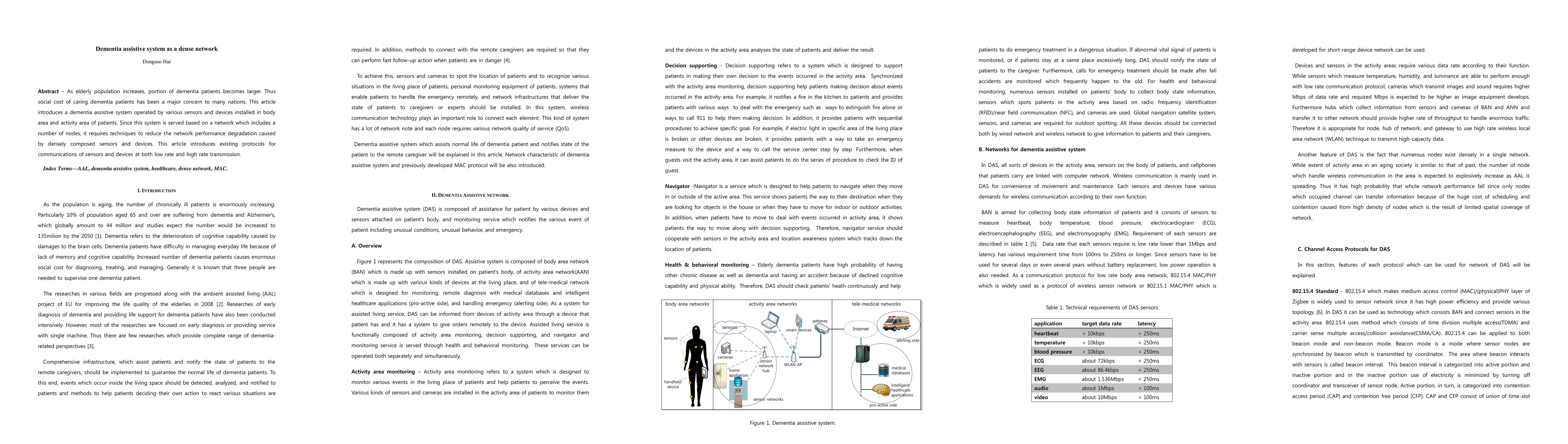 This paper proposes a dementia assistive system utilizing various sensors and devices to monitor patients, addressing the growing social cost of dementia care. It explores dense network protocols to mitigate performance degradation from numerous sensors, focusing on both low and high-rate transmission methods.