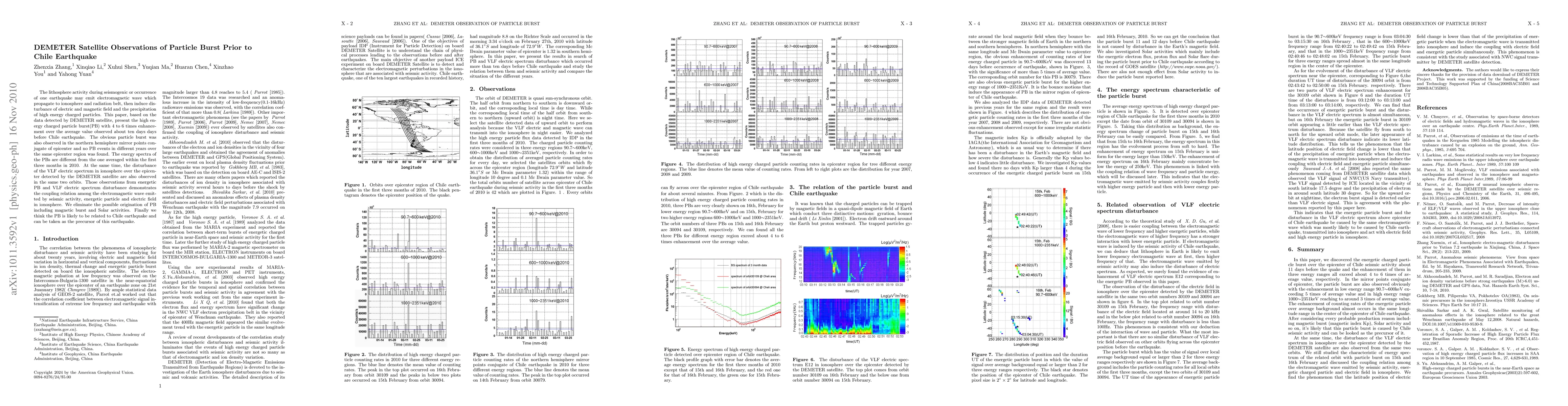 This paper reports a high energy charged particle burst detected by the DEMETER satellite, showing a significant enhancement ten days before the Chile earthquake. The burst and associated VLF electric spectrum disturbances in the ionosphere suggest a coupling relation between seismic activity and electromagnetic phenomena, potentially indicating the particle burst as a precursor to the earthquake.