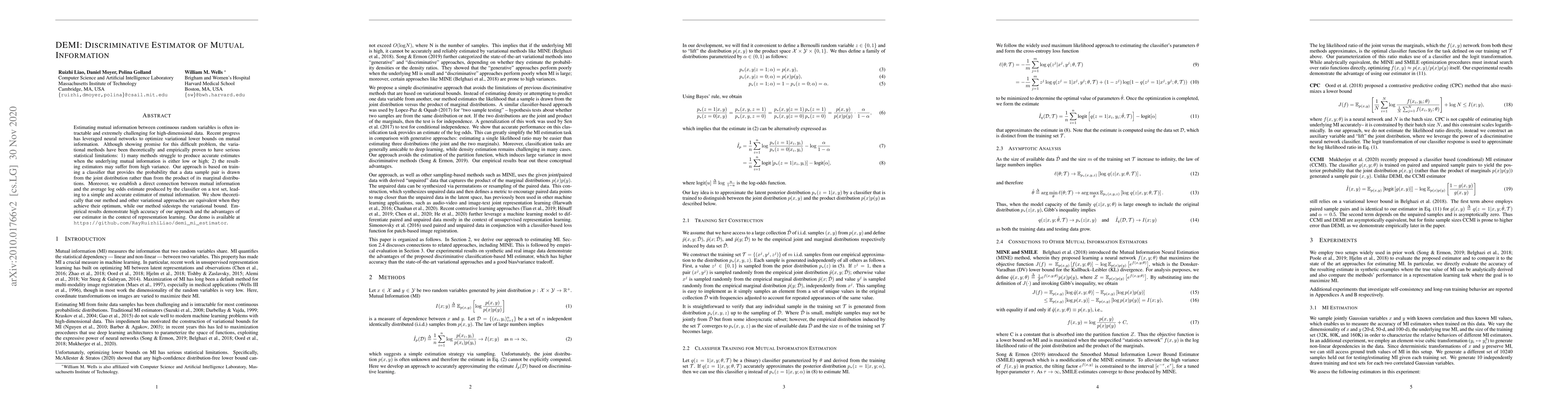 The DEMI method trains a classifier to estimate mutual information between continuous variables by determining if sample pairs come from the joint or marginal distributions, providing a more accurate and less variable estimator compared to variational methods. This approach establishes a direct link between mutual information and the classifier's average log odds, demonstrating high accuracy in representation learning.