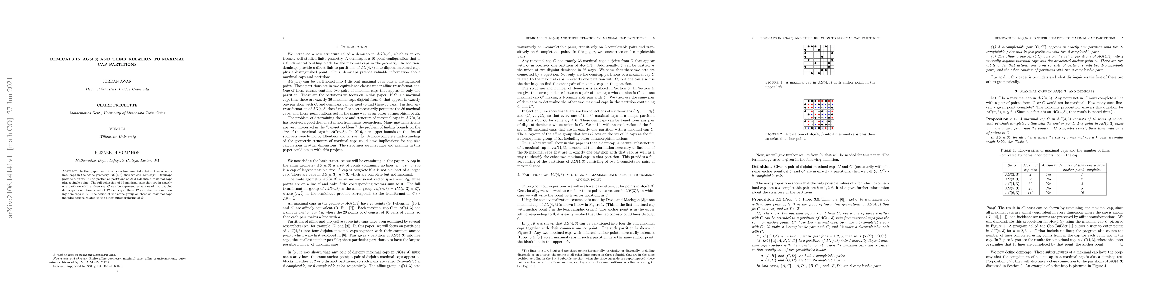 Researchers introduced demicaps in AG(4,3), a fundamental substructure of maximal caps that relate to specific partitions of the geometry into 4 maximal caps plus a single point. The collection of maximal caps can be expressed as unions of two disjoint demicaps.