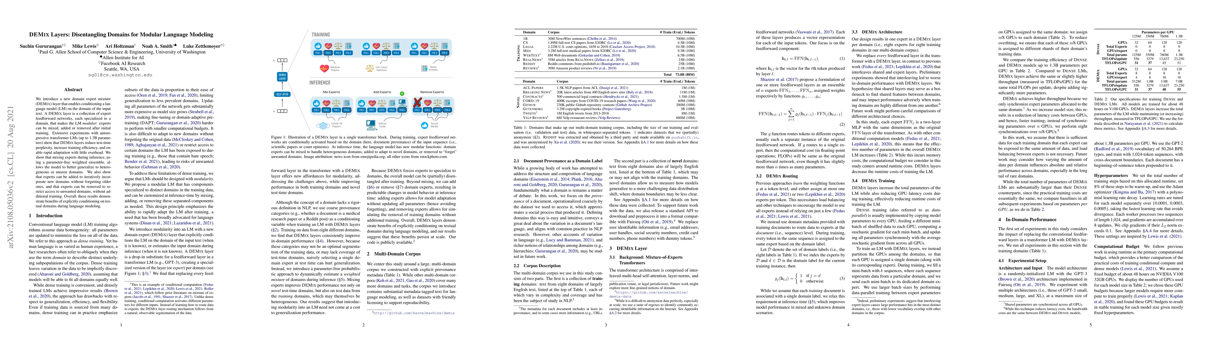 A new layer called DEMix enables language models to adapt to different domains with improved efficiency and performance. It allows for easy mixing and removal of experts during training and inference, demonstrating benefits in conditioning on textual domains during language modeling.