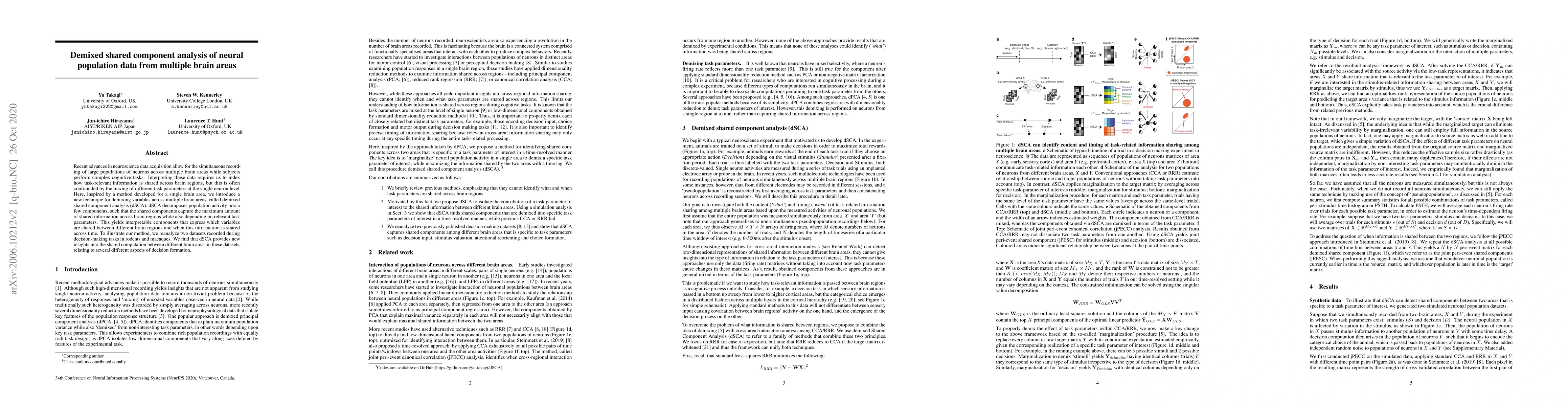 This paper introduces demixed shared component analysis (dSCA), a novel technique for decomposing neural population data across multiple brain regions to identify shared information relevant to cognitive tasks. dSCA reveals shared computations between brain areas during decision-making, offering insights into how different brain regions collaborate in task performance.