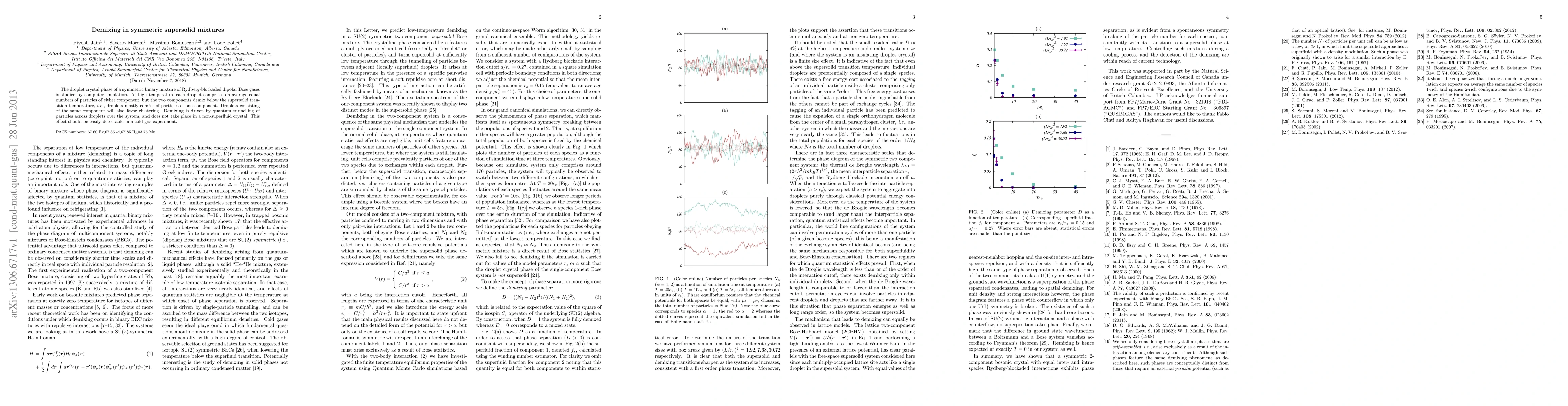 The droplet crystal phase of a symmetric binary mixture of Rydberg-blockaded dipolar Bose gases is studied by computer simulation. At high temperature each droplet comprises on average equal numbers of particles of either component, but the two components demix below the supersolid transition temperature, i.e., droplets mostly consist of particles of one component. Droplets consisting of the same component will also favor clustering. Demixing is driven by quantum tunnelling of particles across droplets over the system, and does not take place in a non-superfluid crystal. This effect should be easily detectable in a cold gas experiment.
