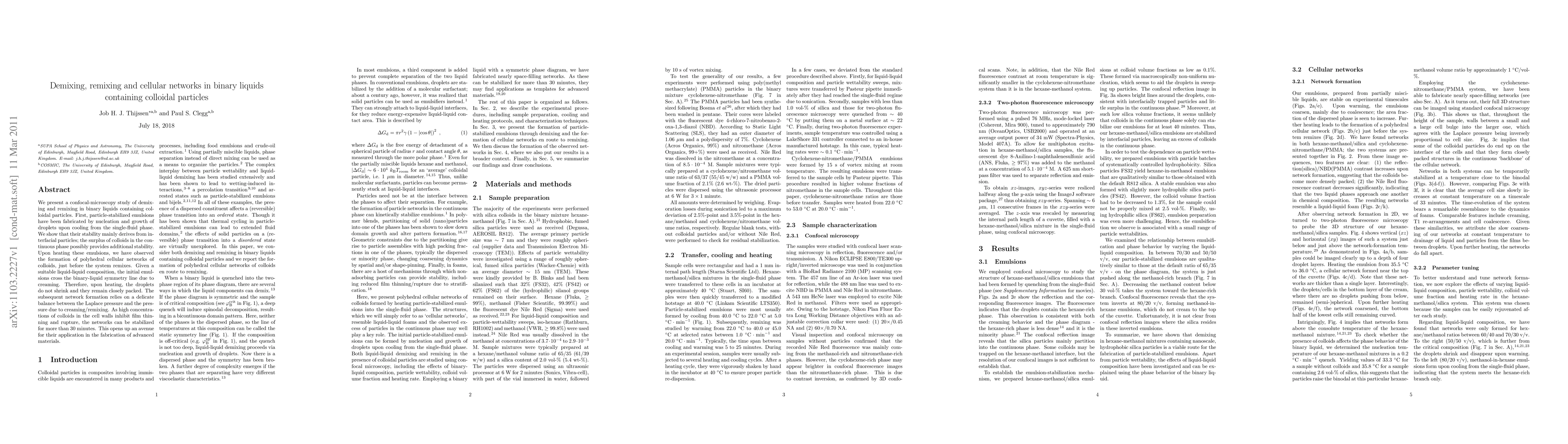 We present a confocal-microscopy study of demixing and remixing in binary liquids containing colloidal particles. First, particle-stabilized emulsions have been fabricated by nucleation and growth of droplets upon cooling from the single-fluid phase. We show that their stability mainly derives from interfacial particles; the surplus of colloids in the continuous phase possibly provides additional stability. Upon heating these emulsions, we have observed the formation of polyhedral cellular networks of colloids, just before the system remixes. Given a suitable liquid-liquid composition, the initial emulsions cross the binary-liquid symmetry line due to creaming. Therefore, upon heating, the droplets do not shrink and they remain closely packed. The subsequent network formation relies on a delicate balance between the Laplace pressure and the pressure due to creaming/remixing. As high concentrations of colloids in the cell walls inhibit film thinning and rupture, the networks can be stabilized for more than 30 minutes. This opens up an avenue for their application in the fabrication of advanced materials.