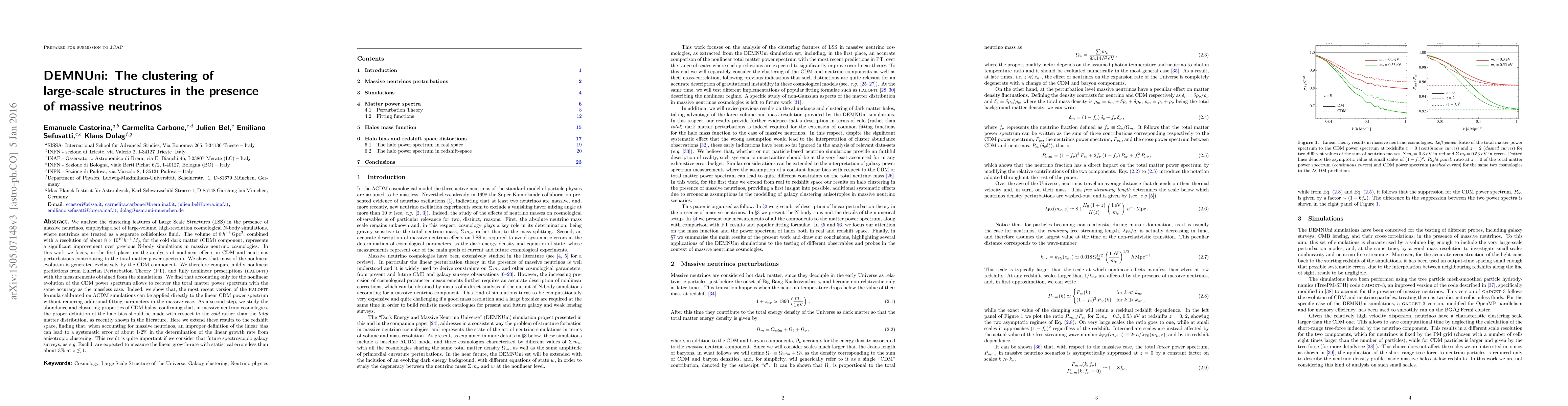 (abridged) We analyse the clustering features of Large Scale Structures (LSS) in the presence of massive neutrinos, employing a set of large-volume, high-resolution cosmological N-body simulations, where neutrinos are treated as a separate collisionless fluid. The volume of 8$\cGpc$, combined with a resolution of about $8\times 10^{10}\Ms$ for the cold dark matter (CDM) component, represents a significant improvement over previous N-body simulations in massive neutrino cosmologies. We show that most of the nonlinear evolution is generated exclusively by the CDM component. We find that accounting only for the nonlinear evolution of the CDM power spectrum allows to recover the total matter power spectrum with the same accuracy as the massless case. Indeed, we show that, the most recent version of the \halofit\ formula calibrated on $\Lambda$CDM simulations can be applied directly to the linear CDM power spectrum without requiring additional fitting parameters in the massive case. As a second step, we study the abundance and clustering properties of CDM halos, confirming that, in massive neutrino cosmologies, the proper definition of the halo bias should be made with respect to the {\em cold} rather than the {\em total} matter distribution, as recently shown in the literature. Here we extend these results to the redshift space, finding that, when accounting for massive neutrinos, an improper definition of the linear bias can lead to a systematic error of about 1-$2 \%$ in the determination of the linear growth rate from anisotropic clustering. This result is quite important if we consider that future spectroscopic galaxy surveys, as \eg\ Euclid, are expected to measure the linear growth-rate with statistical errors less than about $3 \%$ at $z\lesssim1$.