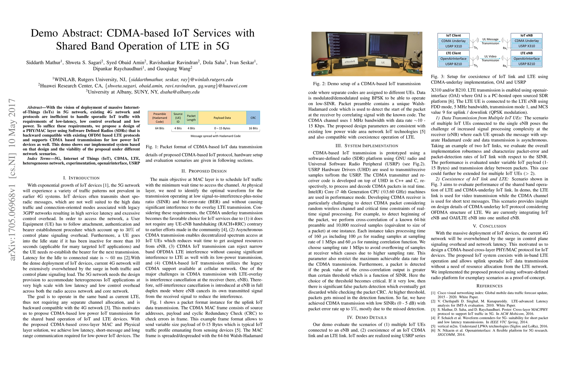 With the vision of deployment of massive Internet-of-Things (IoTs) in 5G network, existing 4G network and protocols are inefficient to handle sporadic IoT traffic with requirements of low-latency, low control overhead and low power. To suffice these requirements, we propose a design of a PHY/MAC layer using Software Defined Radios (SDRs) that is backward compatible with existing OFDM based LTE protocols and supports CDMA based transmissions for low power IoT devices as well. This demo shows our implemented system based on that design and the viability of the proposal under different network scenarios.