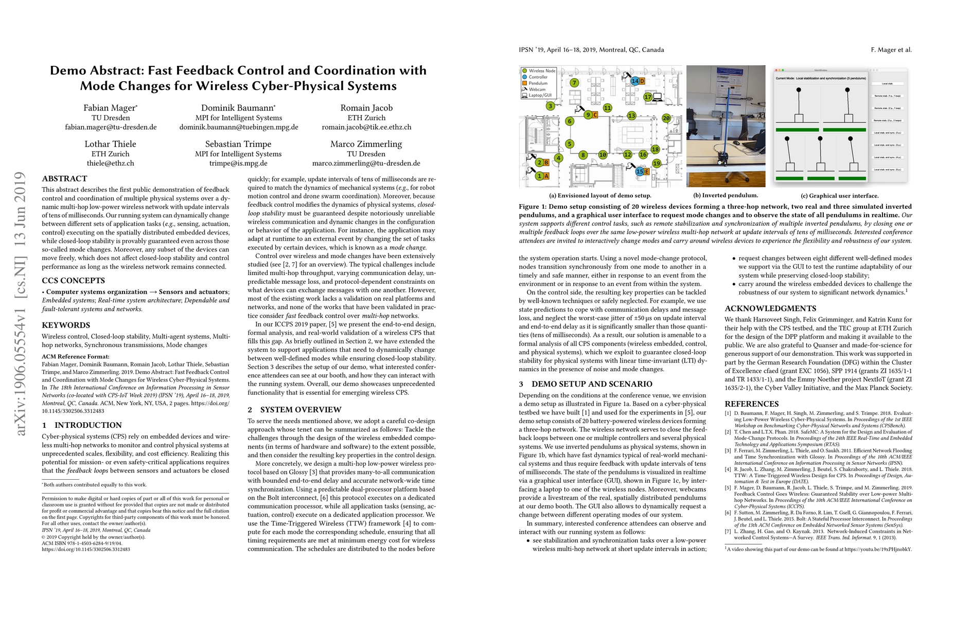 This abstract describes the first public demonstration of feedback control and coordination of multiple physical systems over a dynamic multi-hop low-power wireless network with update intervals of tens of milliseconds. Our running system can dynamically change between different sets of application tasks (e.g., sensing, actuation, control) executing on the spatially distributed embedded devices, while closed-loop stability is provably guaranteed even across those so-called mode changes. Moreover, any subset of the devices can move freely, which does not affect closed-loop stability and control performance as long as the wireless network remains connected.