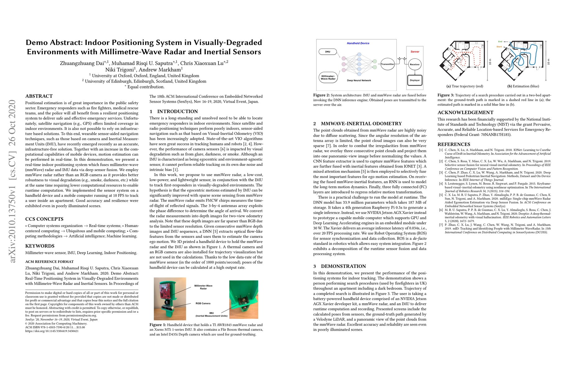 Positional estimation is of great importance in the public safety sector. Emergency responders such as fire fighters, medical rescue teams, and the police will all benefit from a resilient positioning system to deliver safe and effective emergency services. Unfortunately, satellite navigation (e.g., GPS) offers limited coverage in indoor environments. It is also not possible to rely on infrastructure based solutions. To this end, wearable sensor-aided navigation techniques, such as those based on camera and Inertial Measurement Units (IMU), have recently emerged recently as an accurate, infrastructure-free solution. Together with an increase in the computational capabilities of mobile devices, motion estimation can be performed in real-time. In this demonstration, we present a real-time indoor positioning system which fuses millimetre-wave (mmWave) radar and IMU data via deep sensor fusion. We employ mmWave radar rather than an RGB camera as it provides better robustness to visual degradation (e.g., smoke, darkness, etc.) while at the same time requiring lower computational resources to enable runtime computation. We implemented the sensor system on a handheld device and a mobile computer running at 10 FPS to track a user inside an apartment. Good accuracy and resilience were exhibited even in poorly illuminated scenes.