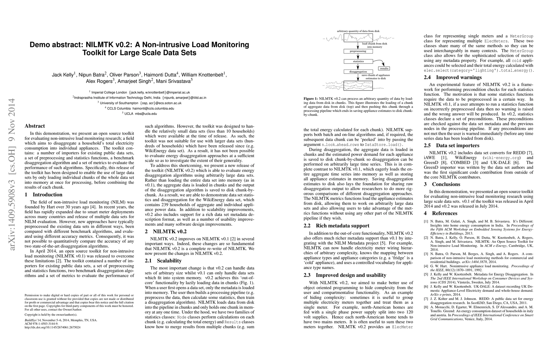This paper introduces NILMTK v0.2, an open-source toolkit for non-intrusive load monitoring research, designed to handle large datasets by processing data in chunks, rather than loading the entire dataset into memory at once. It includes importers for public datasets, preprocessing functions, a benchmark algorithm, and evaluation metrics.