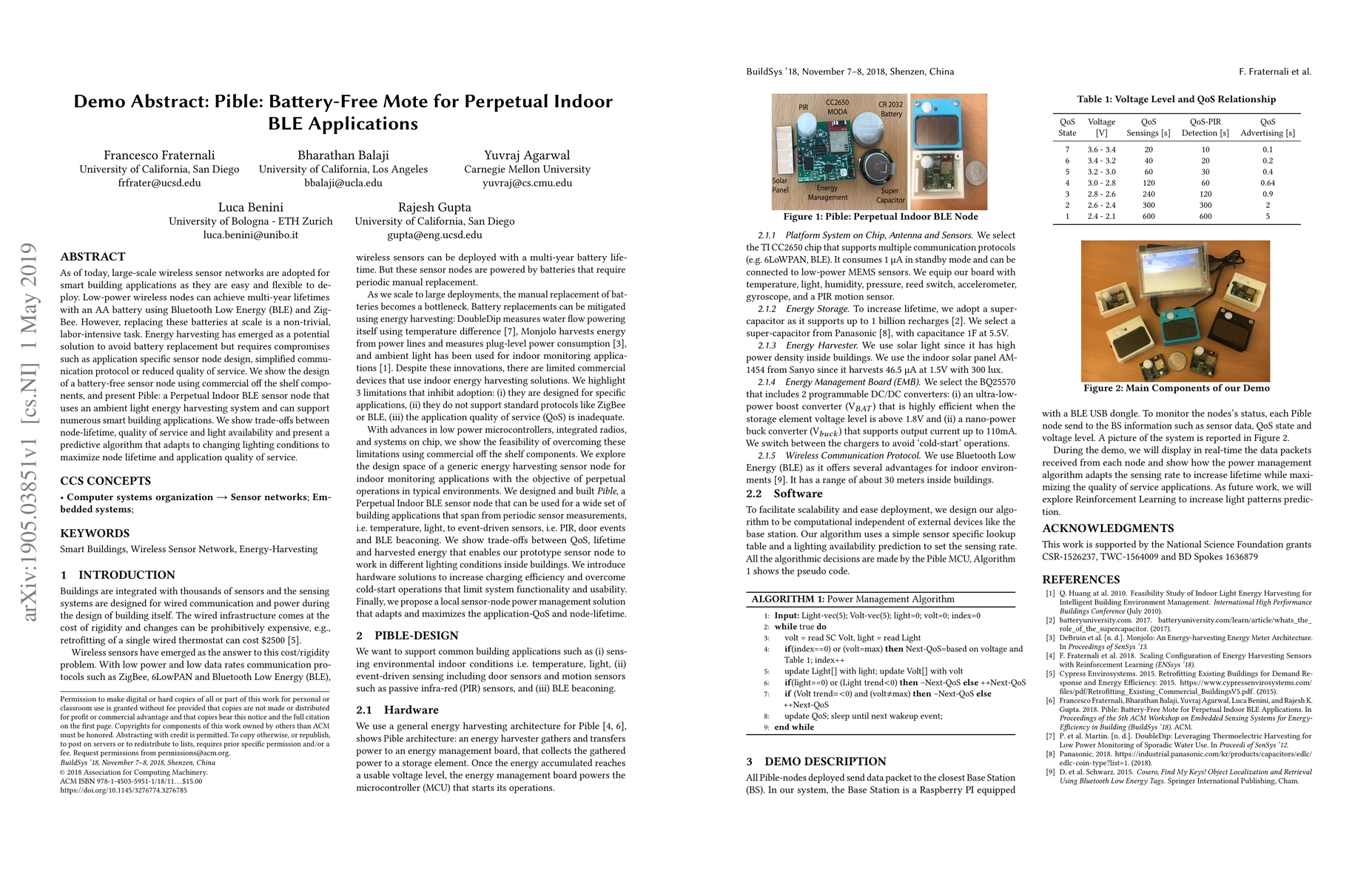 As of today, large-scale wireless sensor networks are adopted for smart building applications as they are easy and flexible to deploy. Low-power wireless nodes can achieve multi-year lifetimes with an AA battery using Bluetooth Low Energy (BLE) and Zig-Bee. However, replacing these batteries at scale is a non-trivial, labor-intensive task. Energy harvesting has emerged as a potential solution to avoid battery replacement but requires compromises such as application specific sensor node design, simplified communication protocol or reduced quality of service. We show the design of a battery-free sensor node using commercial off the shelf components, and present Pible: a Perpetual Indoor BLE sensor node that uses an ambient light energy harvesting system and can support numerous smart building applications. We show trade-offs between node-lifetime, quality of service and light availability and present a predictive algorithm that adapts to changing lighting conditions to maximize node lifetime and application quality of service.