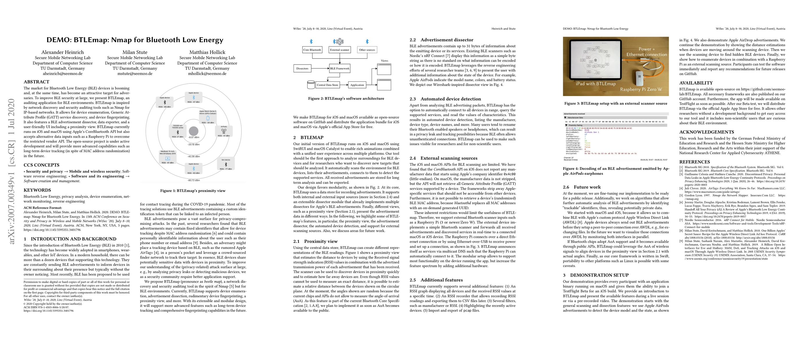 Researchers introduce BTLEmap, a Bluetooth Low Energy auditing tool that scans for devices, discovers services, and tracks devices over time, aiming to improve BLE security.