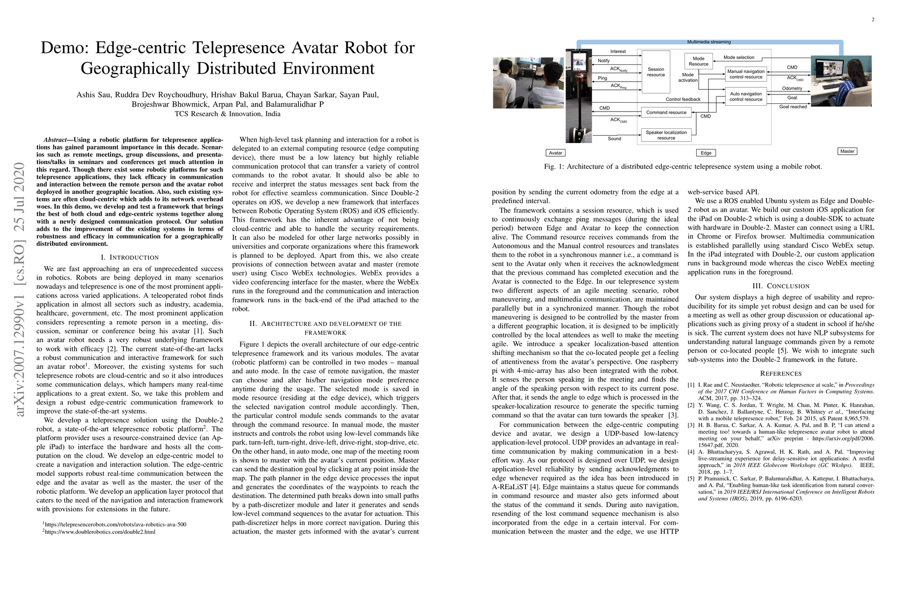 Using a robotic platform for telepresence applications has gained paramount importance in this decade. Scenarios such as remote meetings, group discussions, and presentations/talks in seminars and conferences get much attention in this regard. Though there exist some robotic platforms for such telepresence applications, they lack efficacy in communication and interaction between the remote person and the avatar robot deployed in another geographic location. Also, such existing systems are often cloud-centric which adds to its network overhead woes. In this demo, we develop and test a framework that brings the best of both cloud and edge-centric systems together along with a newly designed communication protocol. Our solution adds to the improvement of the existing systems in terms of robustness and efficacy in communication for a geographically distributed environment.