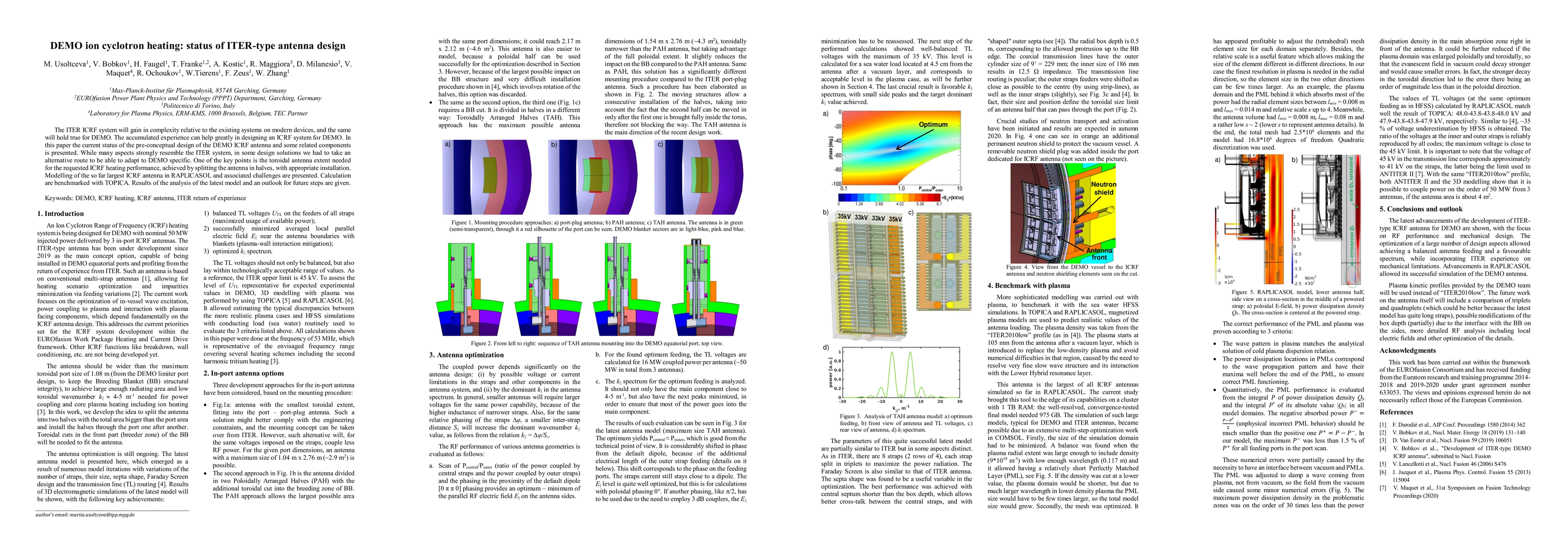 The ITER ICRF system will gain in complexity relative to the existing systems on modern devices, and the same will hold true for DEMO. The accumulated experience can help greatly in designing an ICRF system for DEMO. In this paper the current status of the pre-conceptual design of the DEMO ICRF antenna and some related components is presented. While many aspects strongly resemble the ITER system, in some design solutions we had to take an alternative route to be able to adapt to DEMO specific. One of the key points is the toroidal antenna extent needed for the requested ICRF heating performance, achieved by splitting the antenna in halves, with appropriate installation. Modelling of the so far largest ICRF antenna in RAPLICASOL and associated challenges are presented. Calculation are benchmarked with TOPICA. Results of the analysis of the latest model and an outlook for future steps are given.