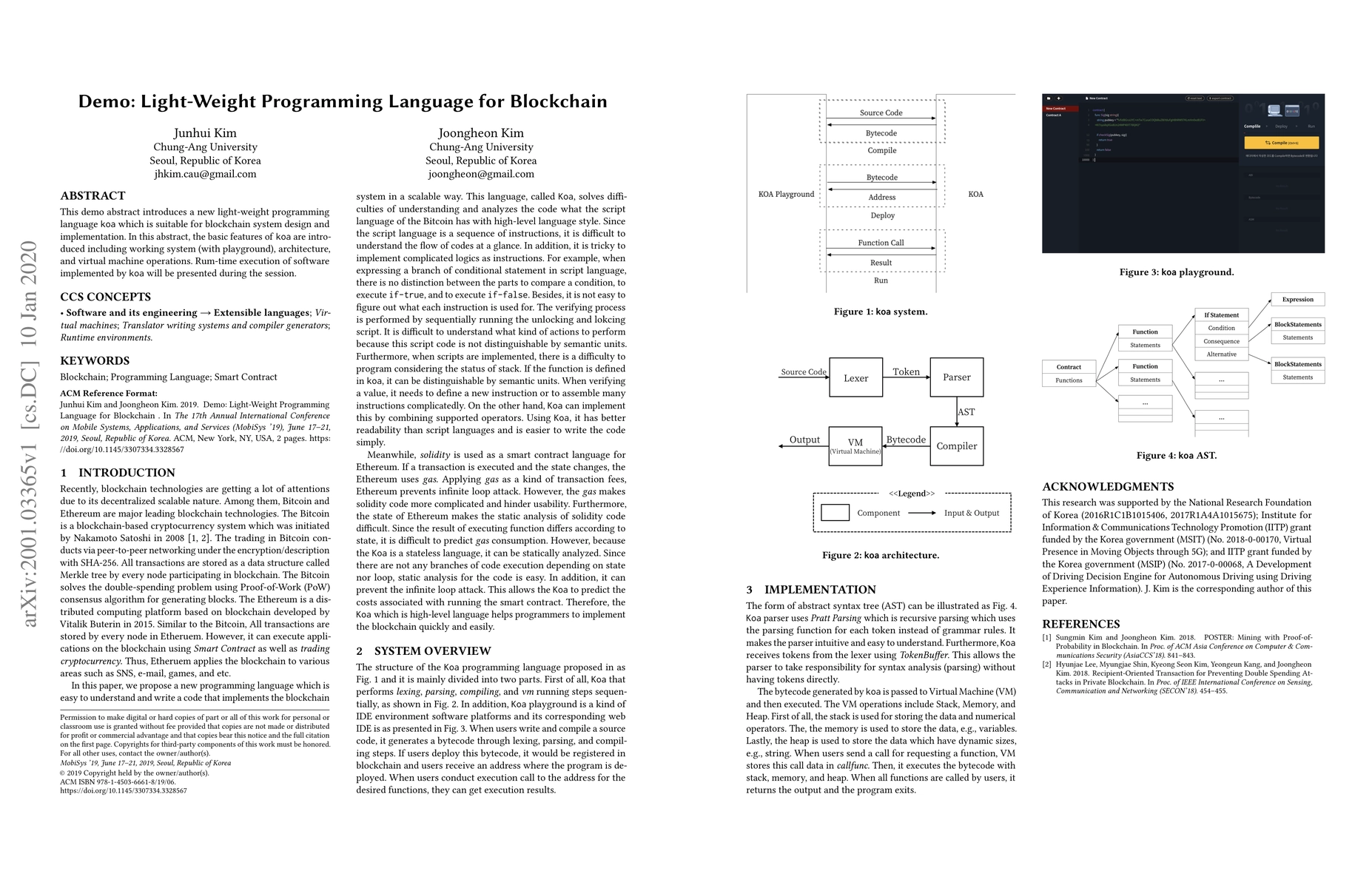 This demo abstract introduces a new light-weight programming language koa which is suitable for blockchain system design and implementation. In this abstract, the basic features of koa are introduced including working system (with playground), architecture, and virtual machine operations. Rum-time execution of software implemented by koa will be presented during the session.